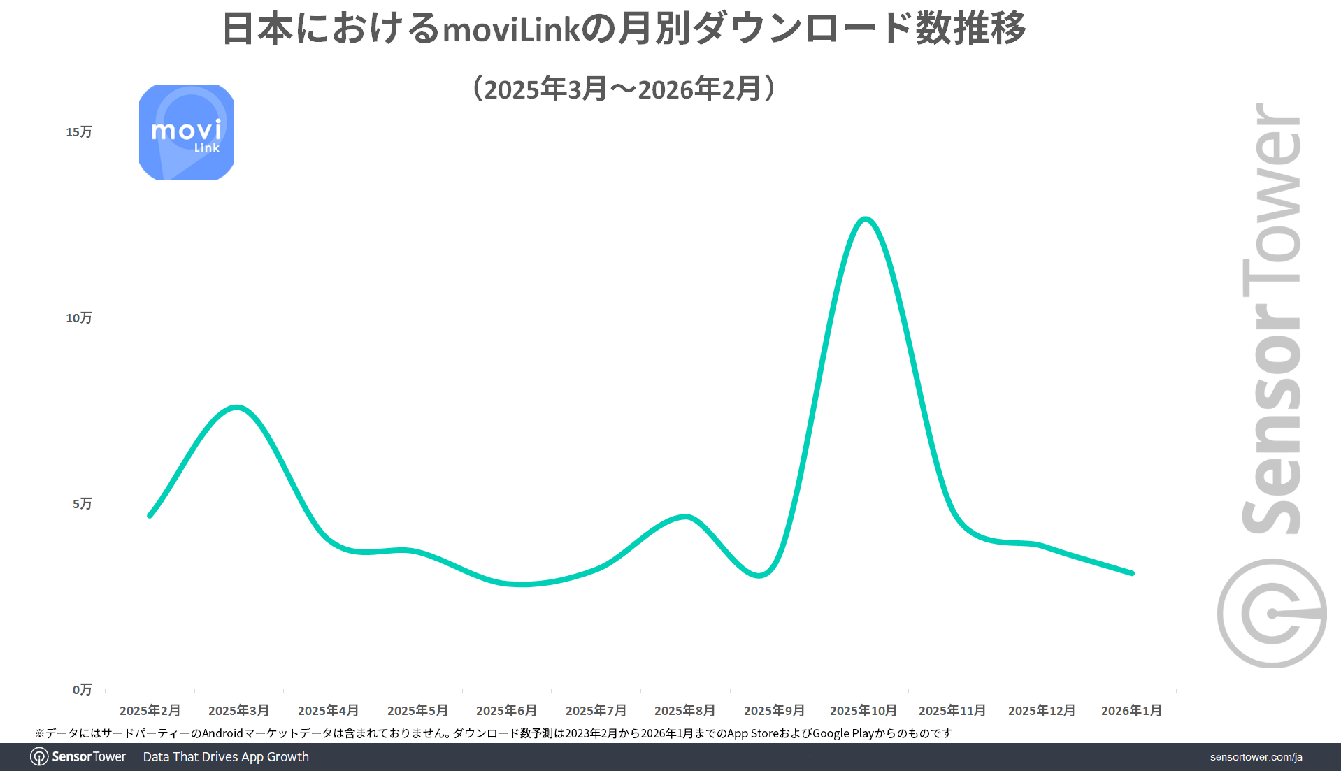 2021年3月にリリースされた『moviLink』は、Sensor Towerのデータによると、累計200万以上のダウンロード数を達成しています。また、直近1年間のダウンロード数推移を見ても好水準をキープしており、2025年10月には月間10万以上のダウンロード数が確認できます。