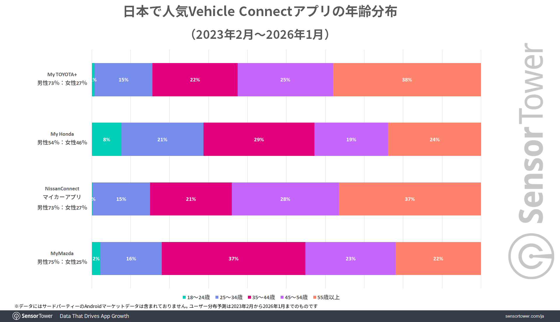 半導体や原材料費高騰の影響で、自動車価格も上昇傾向にありますが、自動車用アプリはどういった層に利用されているのでしょうか。Sensor Towerのデータによると、2023年2月から2026年1月までの日本で人気の自動車用アプリのユーザー分布を見ると、いずれのアプリも男性ユーザーが多くなっています。