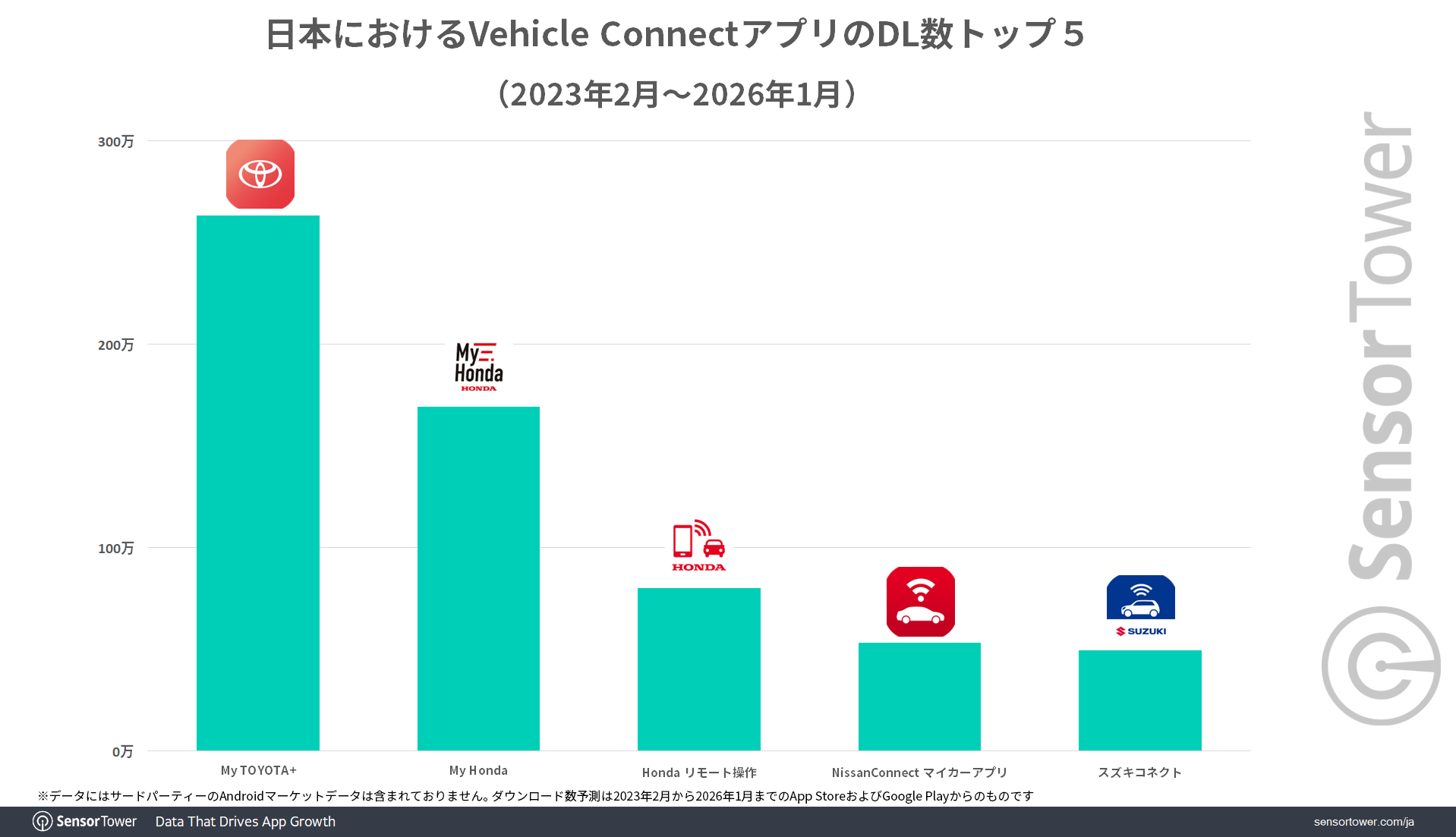 Sensor Towerのデータによると、過去3年間(2023年2月から2026年1月)の日本における自動車用アプリ(App IQ:Vehicle Connect)のダウンロード数を見ると、『My TOYOTA+』(Toyota Motor Corporation)が250万以上を記録してトップとなっています。
