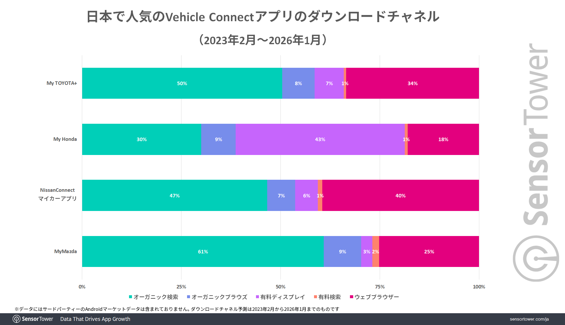 では、自動車用アプリはどういったチャネルからダウンロードされているのでしょうか。Sensor Towerのデータによると、2023年2月から2026年1月までの日本で人気の自動車用アプリのダウンロードチャネルを見ると、各社の違いが見えます。