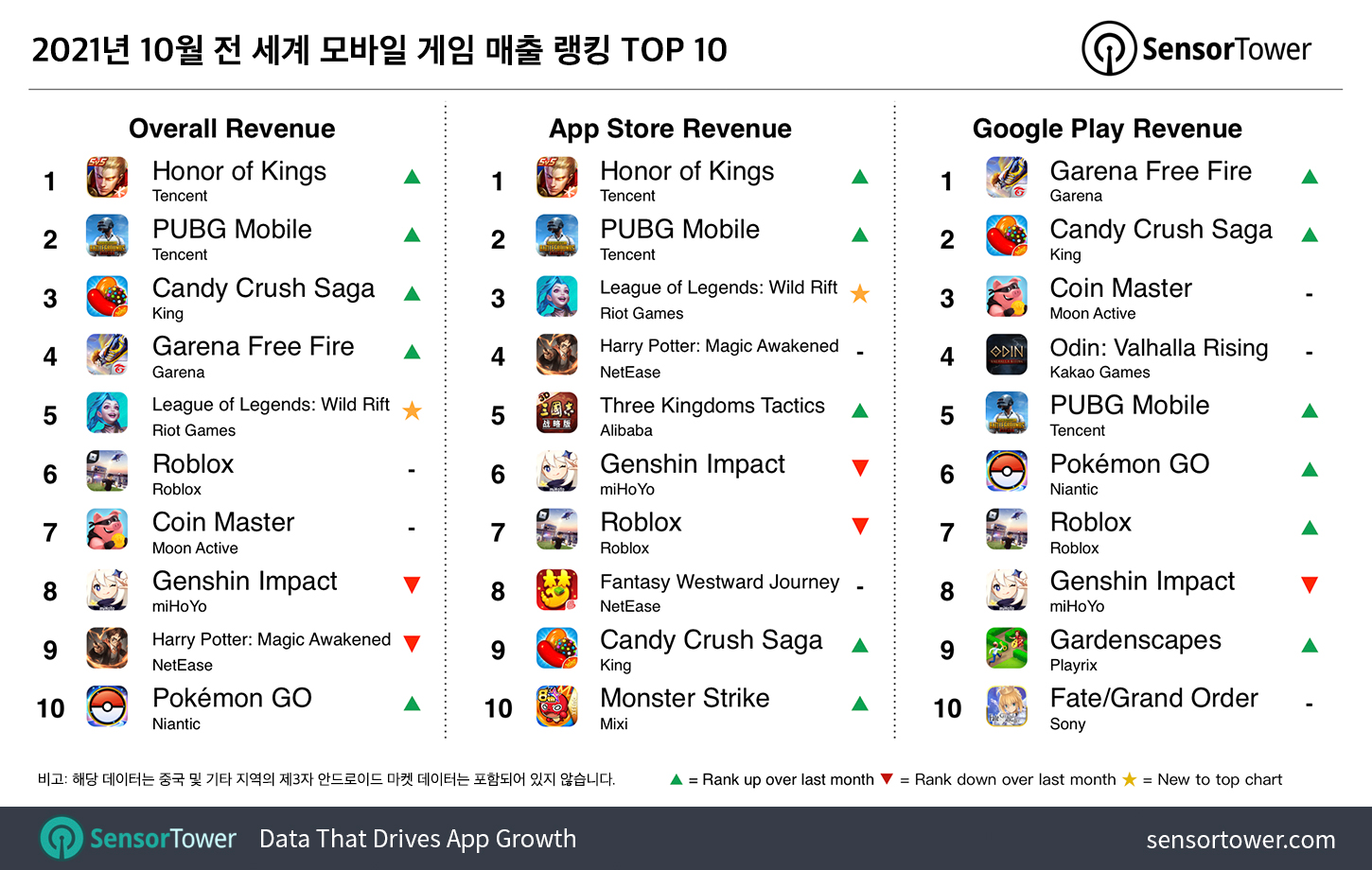 랭킹 TOP 5위의 다른 3개 타이틀에는 각각 King의《캔디크러쉬사가(Candy Crush Saga)》, Garena의《Free Fire》와 Riot Games의《리그 오브 레전드: 와일드 리프트(League of Legends: Wild Rift)》가 있습니다.