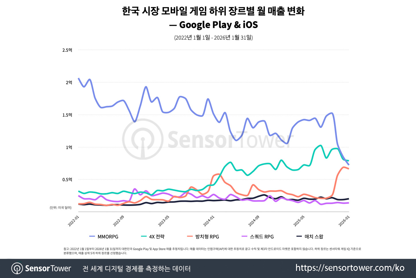 그러나 2026년 1월, 모바일 게임 하위 장르별 매출 구도에 의미 있는 변화가 포착되었습니다. 4X 전략 장르가 월간 매출 기준으로 MMORPG를 처음으로 넘어선 것인데요. MMORPG 중심의 고과금, 장기 플레이 문화에 익숙한 한국 시장에서, 4X 전략은 MMORPG와 유사한 과금 구조와 운영 방식을 바탕으로 빠르게 확산된 것으로 분석됩니다.
