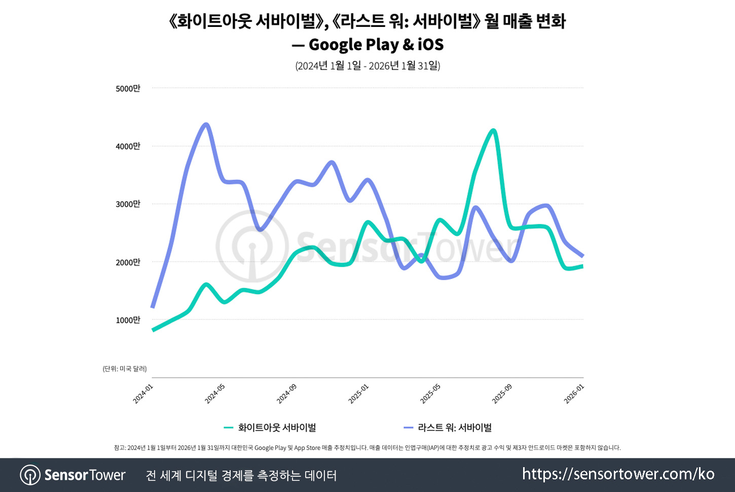 4X 전략 장르의 성장은 《화이트아웃 서바이벌》과 《라스트 워: 서바이벌》이 주도했습니다. 두 게임은 2025년 1월부터 2026년 1월까지 한국 모바일 게임 매출 TOP 5에 이름을 올리며, MMORPG 중심의 상위권 구도 속에서도 존재감을 유지했습니다.