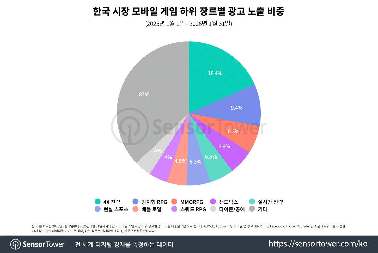 센서타워 시장 규모 데이터를 기준으로 한국 모바일 게임 시장의 하위 장르별 광고 노출 점유율을 살펴보면, 4X 전략은 전체 모바일 게임 광고 노출의 약 19%를 차지하며 가장 높은 비중을 기록했습니다.