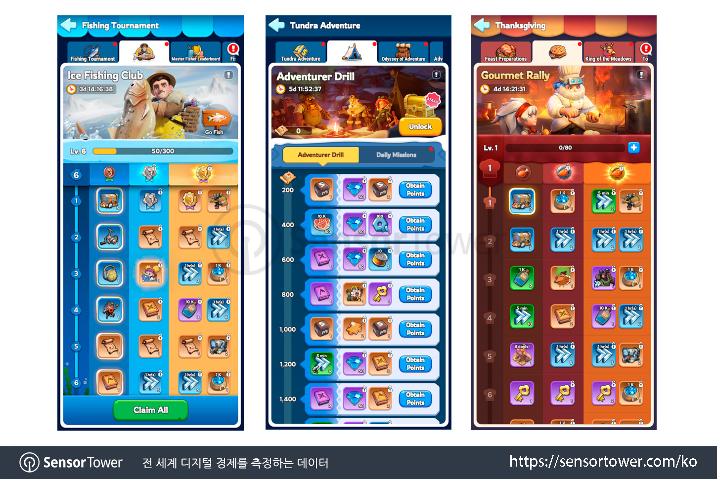 한편, 센서타워 라이브옵스 인사이트를 통해서는 출시 후 2-3년이 지난 성숙 단계의 타이틀 역시 운영 전략을 통해 매출 성과를 이어가고 있다는 점이 확인됩니다. 《화이트아웃 서바이벌》은 월 단위로 이벤트가 밀도 있게 배치되면서, 플레이 참여가 특정 시점에 집중되기보다 지속적으로 이어지는 운영 흐름을 형성하고 있습니다.