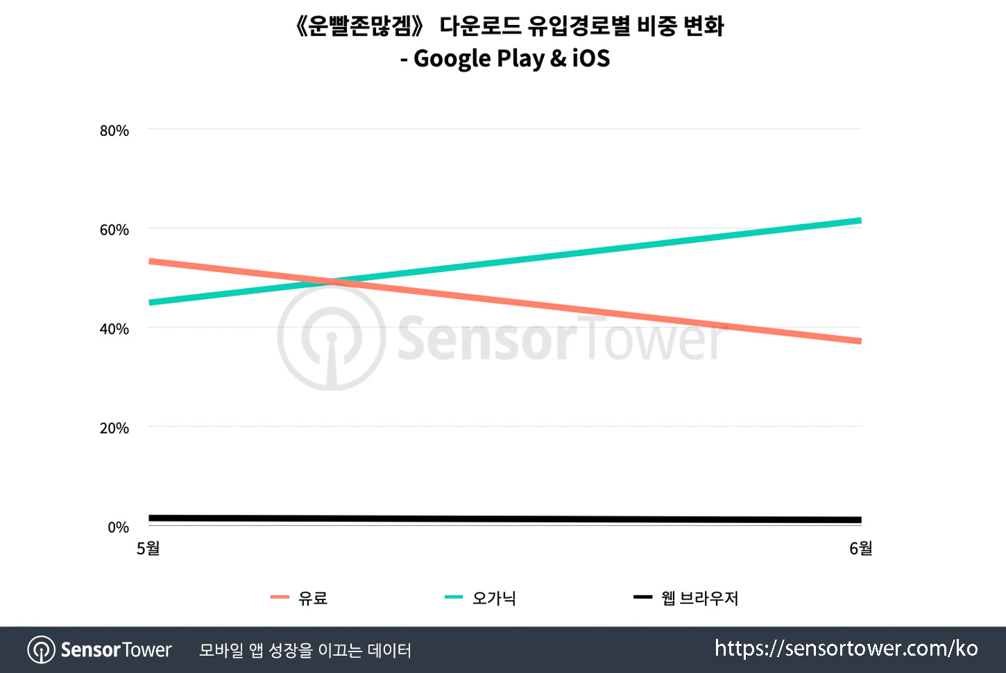 센서타워 다운로드 유입경로에 따르면, 출시 초기 《운빨존많겜》의 다운로드는 유료 채널을 통해 이뤄졌습니다. 하지만, 시간이 지나면서 오가닉 다운로드가 유료를 넘어서는 양상을 보였는데요.