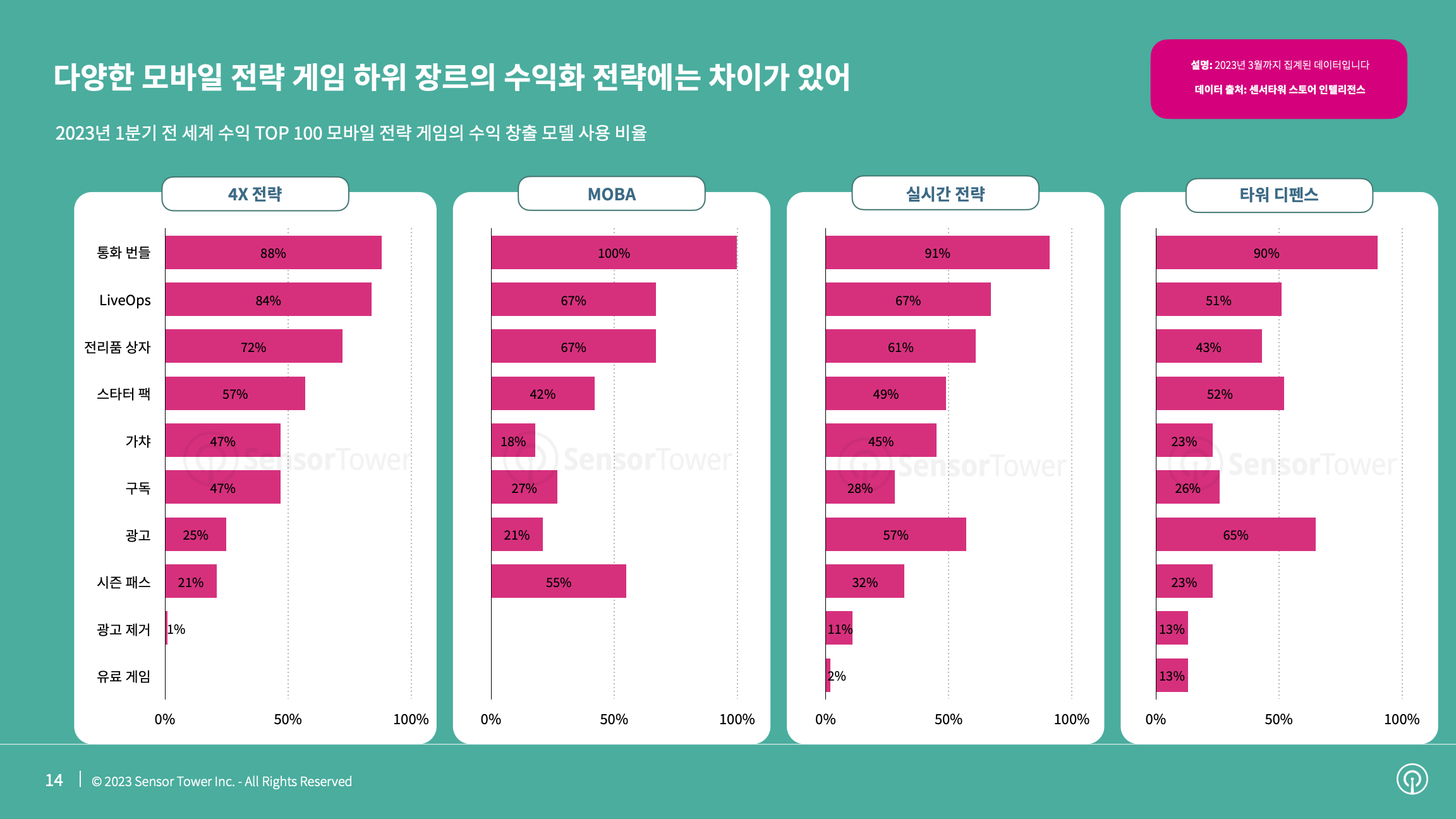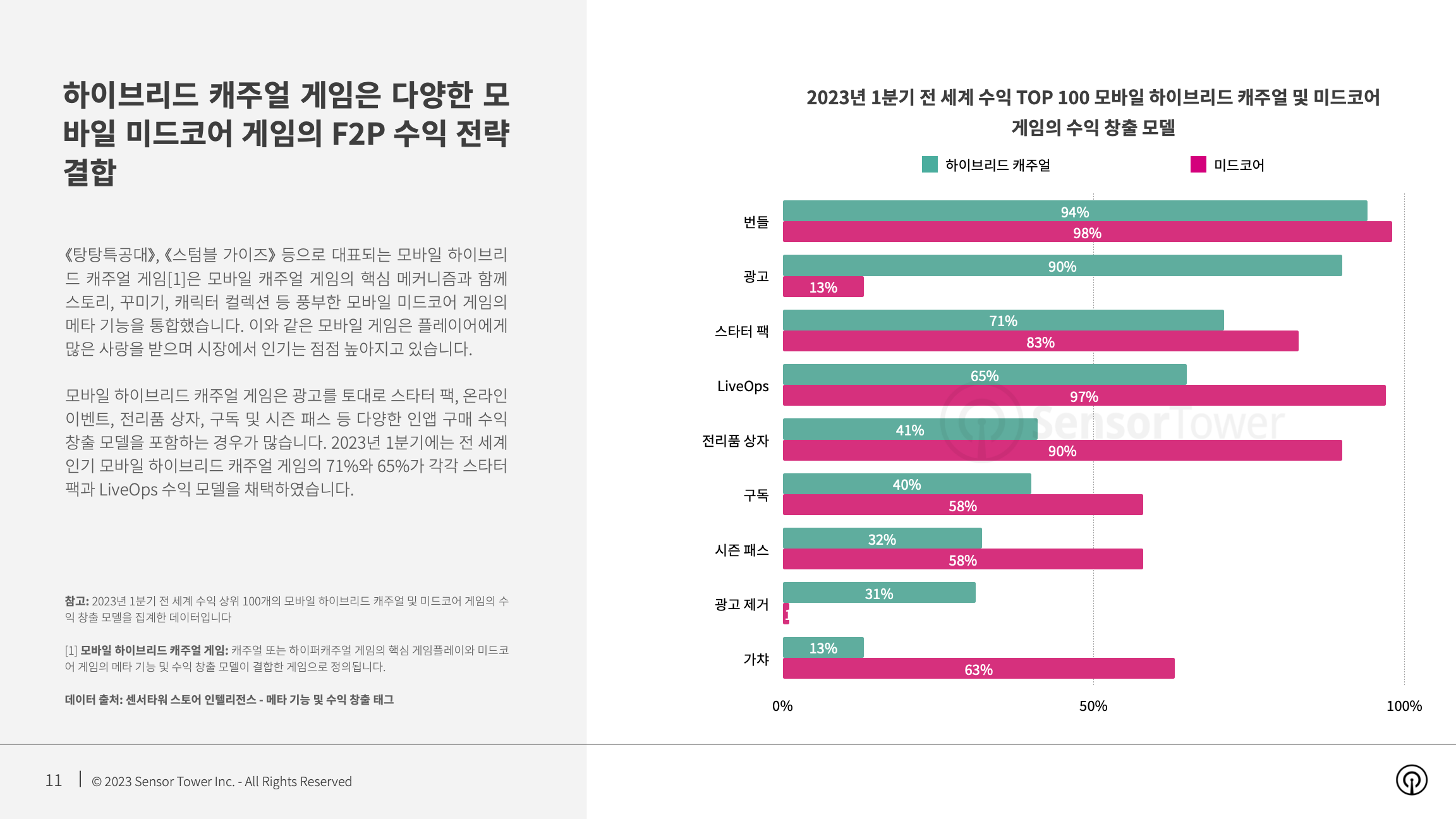 멀티 전략을 갖는 하이브리드 수익 모델은 전 세계 주요 모바일 게임의 수익 성장과 장기적인 수익 창출을 위한 주요 트렌드가 되었으며, 2023년 1분기 전 세계 수익 상위 100개 모바일 게임 중 4개 이상의 수익화 모델을 갖고 있는 모바일 게임의 비율이 97%나 되었습니다. 《2023년 전 세계 모바일 게임 수익 창출 트렌드 인사이트》는 전 세계 모바일 게임의 최신 수익화 전략과 트렌드를 분석하고, 다양한 장르의 모바일 게임의 수익화 전략을 파악하며, 주요 모바일 게임의 성공적인 수익화 경험을 분석합니다. 더 자세한 내용은 리포트 전문에서 확인하실 수 있습니다. 아래에 있는 '전체 리포트 읽기'를 클릭해 무료로 리포트를 다운로드하세요!