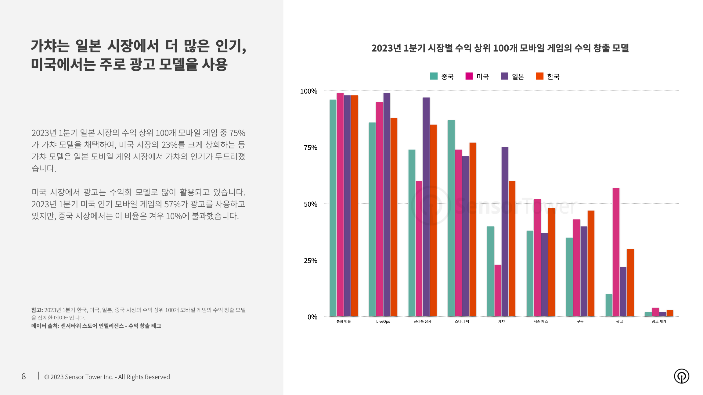 일본 모바일 게임 시장에서 가챠가 더 인기 있고, 미국에서는 광고가 더 인기 있는 등 시장마다 주요 모바일 게임이 수익화를 위해 사용하는 전략에는 차이가 있었었습니다.