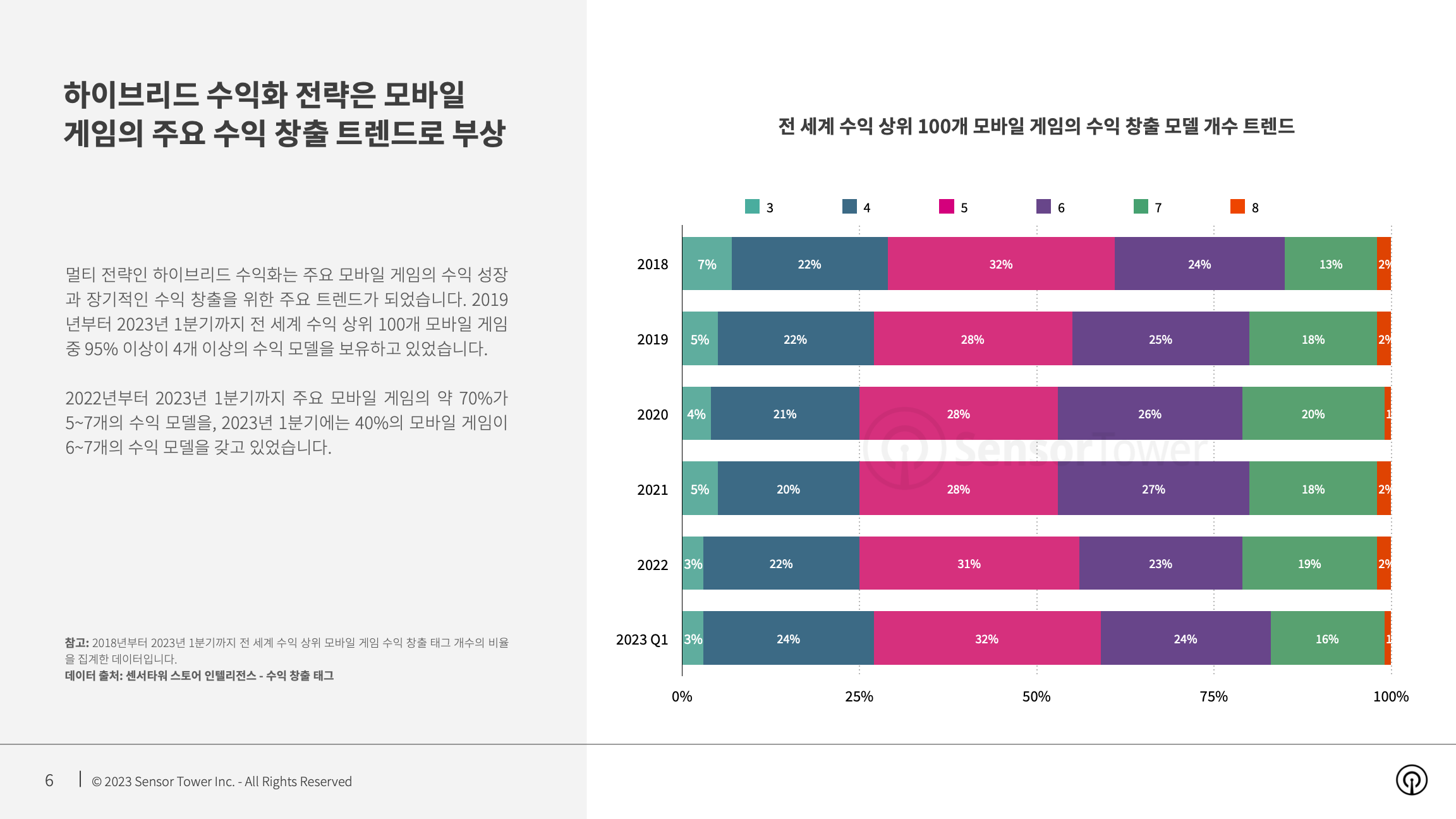 2019년부터 2023년 1분기까지 전 세계 수익 TOP 100 모바일 게임 중, 95% 이상의 모바일 게임은 4개 이상의 수익 모델을 갖고 있어, 하이브리드 수익 모델은 이미 주요 모바일 게임의 수익 창출의 주요 트렌드로 자리 잡았습니다. 2023년 1분기에는 약 40%의 모바일 게임이 6~7개의 수익 모델을 갖고 있었습니다.