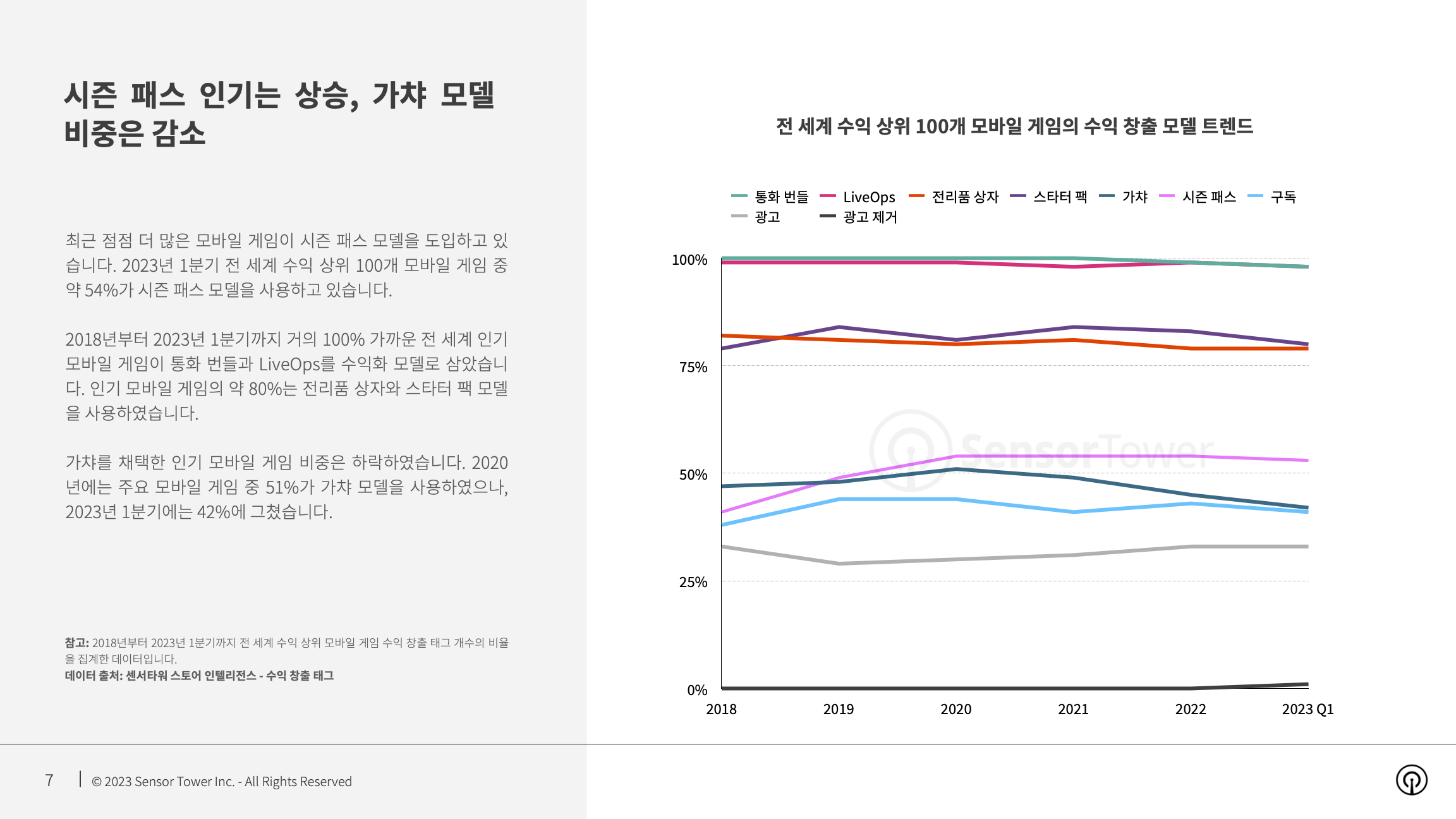 최근 점점 더 많은 주요 모바일 게임이 시즌 패스 모델을 도입하여 수익을 창출하고 있습니다. 2023년 1분기 전 세계 수익 TOP 100 모바일 게임 중 54%가 시즌 패스를 사용하고 있었습니다.