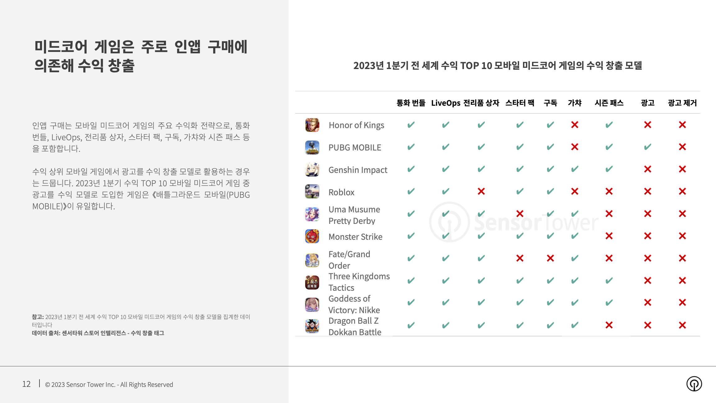 모바일 미드코어 게임은 번들, LiveOps, 전리품 상자, 스타터 팩, 구독, 가챠, 시즌 패스 등 인앱 구매를 주요 수익화 방식으로 하고 있으며, 광고 수익화 전략은 주요 모바일 미드코어 게임 중 소수만 채택하고 있었습니다.