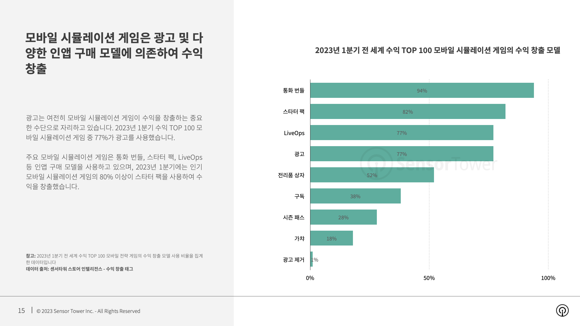 광고는 여전히 모바일 시뮬레이션 게임이 수익을 창출하는 중요한 수단으로 자리하고 있습니다. 2023년 1월 수익 상위 100개 모바일 시뮬레이션 게임 중 77%가 광고 전략을 사용하였습니다. 주요 모바일 시뮬레이션 게임은 번들, 스타터 팩, LiveOps 등 인앱 구매 모델도 도입하고 있습니다.