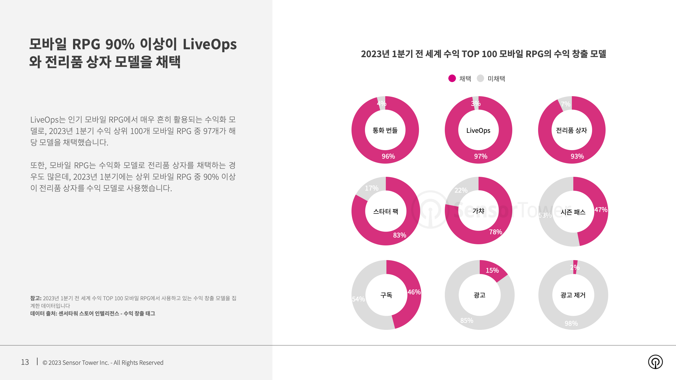 모바일 RPG는 LiveOps를 매우 중요시하고 있으며, 2023년 1분기 전 세계 수익 TOP 100 모바일 RPG 중, 97개가 LiveOps를 사용하여 수익을 올리고 있었습니다. 동시에 전리품 상자를 통한 수익화 전략도 인기 모바일 RPG에서 자주 사용되고 있었습니다.