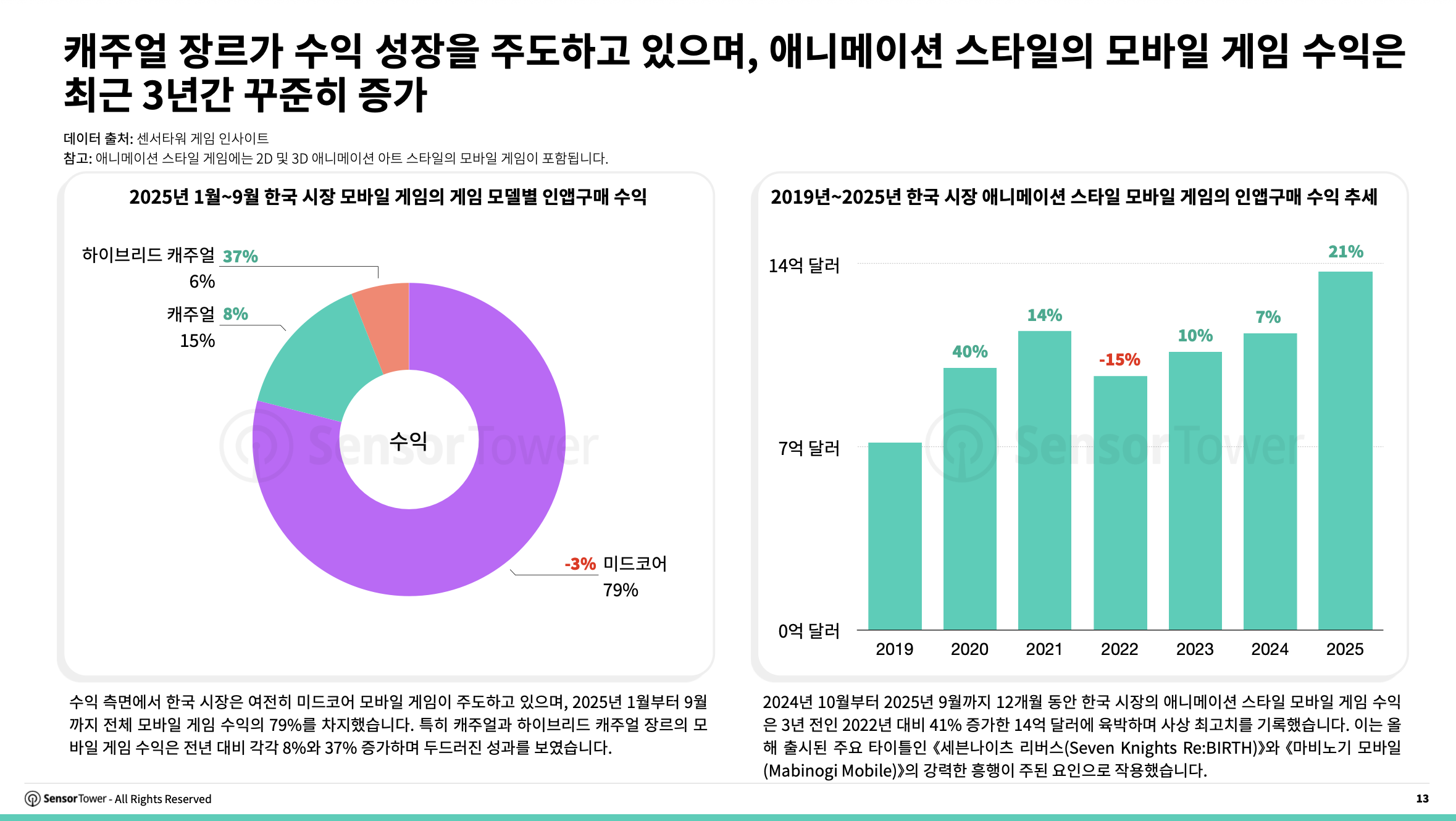 한국 시장에서 미드코어 모바일 게임은 여전히 주도적인 위치를 차지하며, 2025년 1월부터 9월까지 전체 모바일 게임 수익의 79%를 기여했습니다. 특히 캐주얼과 하이브리드 캐주얼 게임의 수익은 각각 전년 대비 8%와 37% 증가하며 두드러진 성장세를 보였습니다.
