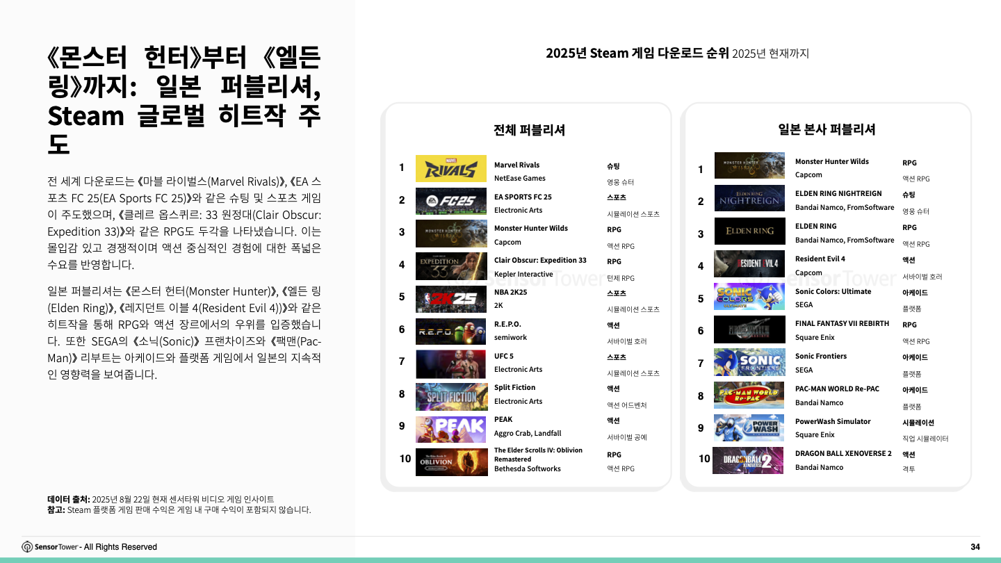 일본 퍼블리셔는 《몬스터 헌터 와일즈(Monster Hunter Wilds)》, 《엘든 링(Elden Ring)》, 《레지던트 이블 4(Resident Evil 4)》와 같은 히트작을 선보이며 RPG와 액션 장르에서의 우위를 입증했습니다. SEGA의 《소닉(Sonic)》 프랜차이즈와 《팩맨(Pac-Man)》 리부트는 아케이드와 플랫폼 장르에서도 일본의 지속적인 영향력을 잘 보여줍니다.