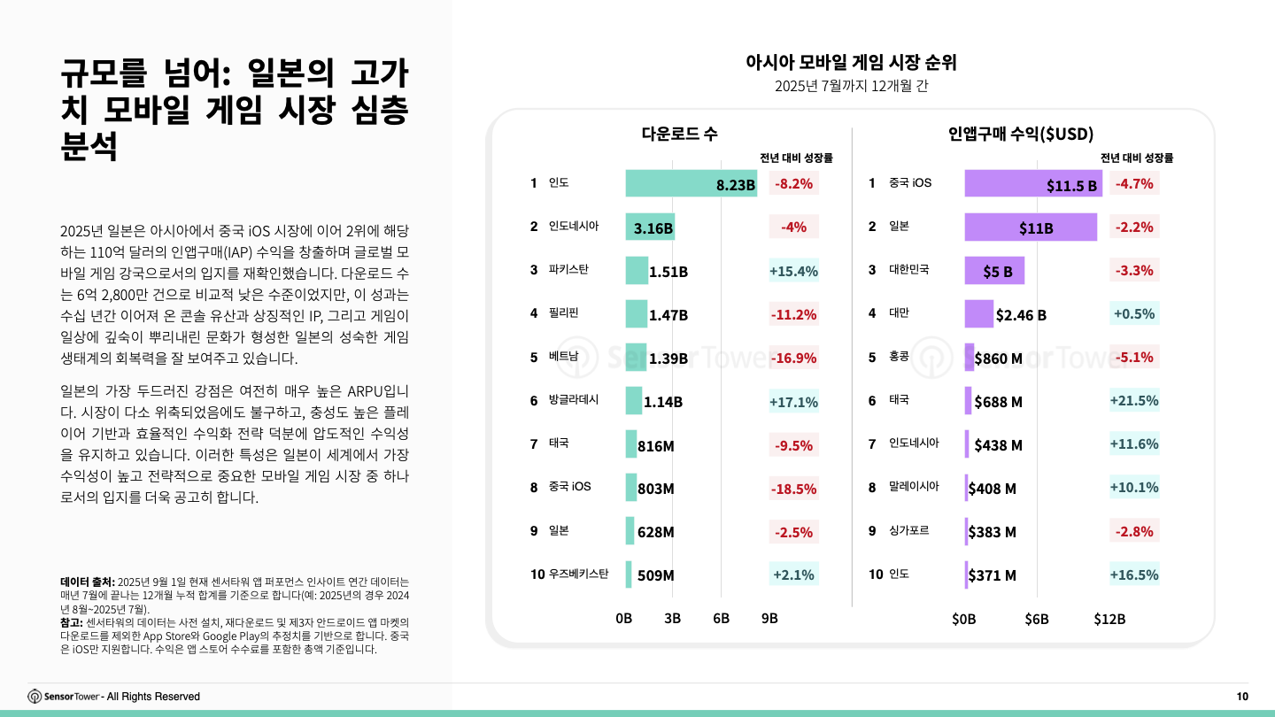 일본 시장의 가장 큰 강점은 여전히 매우 높은 ARPU입니다. 시장이 다소 위축됐음에도, 충성도 높은 플레이어 기반과 효율적인 수익화 전략에 힘입어 여전히 높은 수익성을 기록하고 있습니다. 이러한 흐름은 일본이 세계에서 가장 수익성이 높고 전략적으로 중요한 모바일 게임 시장 중 하나임을 다시금 보여줍니다.