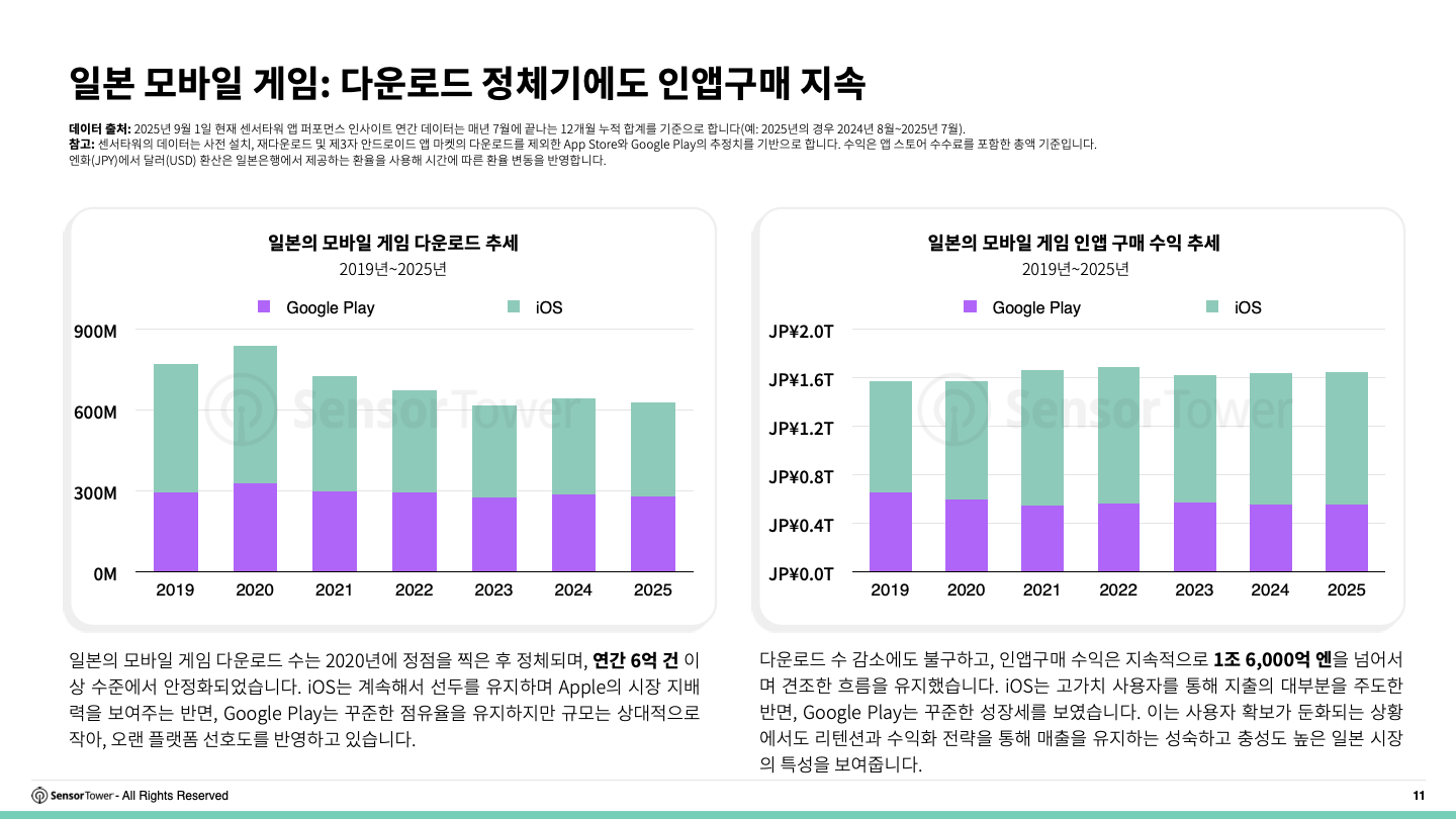 다운로드 수 감소에도 불구하고, 인앱구매 수익은 꾸준히 1조 6,000억 엔을 웃돌며 견조한 흐름을 보였습니다. iOS는 고가치 플레이어를 기반으로 대부분의 지출을 이끌고 있으며, Google Play 역시 안정적인 성장을 이어가고 있습니다. 이는 플레이어 획득이 둔화되는 상황에서도 리텐션과 수익화가 매출을 유지하게 하는, 성숙하고 충성도 높은 일본 시장의 특성을 보여줍니다.