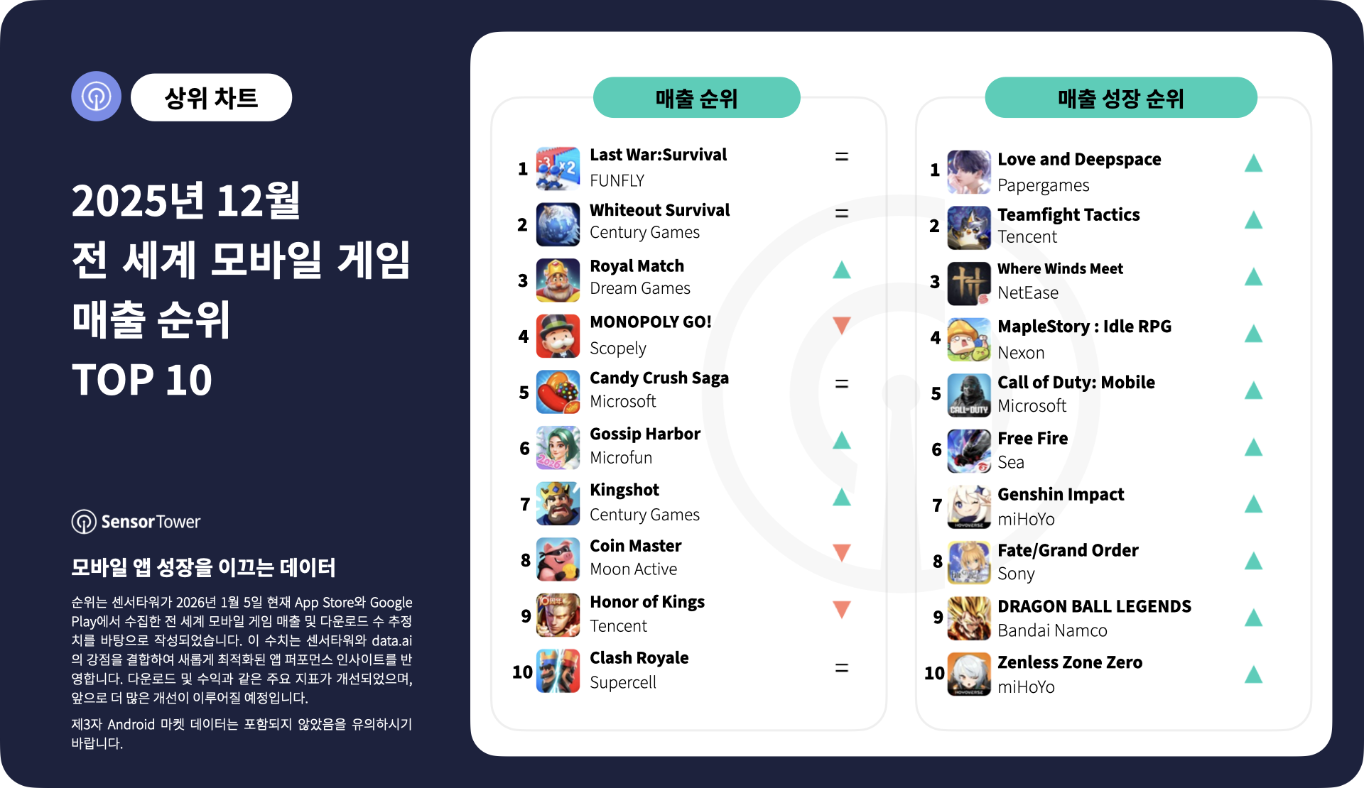 12월 매출 성장 순위에서는 대규모 업데이트와 IP 기반 참여 전략에 힘입은 RPG 및 라이브 서비스형 타이틀의 강세가 두드러지게 나타났습니다.