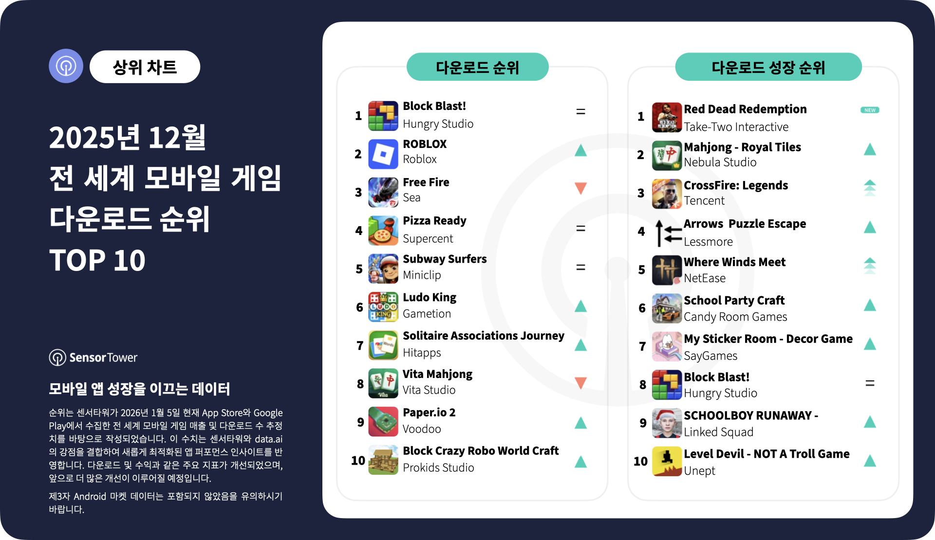 《블록 블라스트》가 2025년 12월 전 세계에서 가장 많이 다운로드된 모바일 게임으로 자리매김했습니다. 《로블록스》가 2위를 차지했으며, 《Free Fire》, 《피자 레디》, 《서브웨이 서퍼》가 그 뒤를 이어 상위 5위를 기록했습니다.