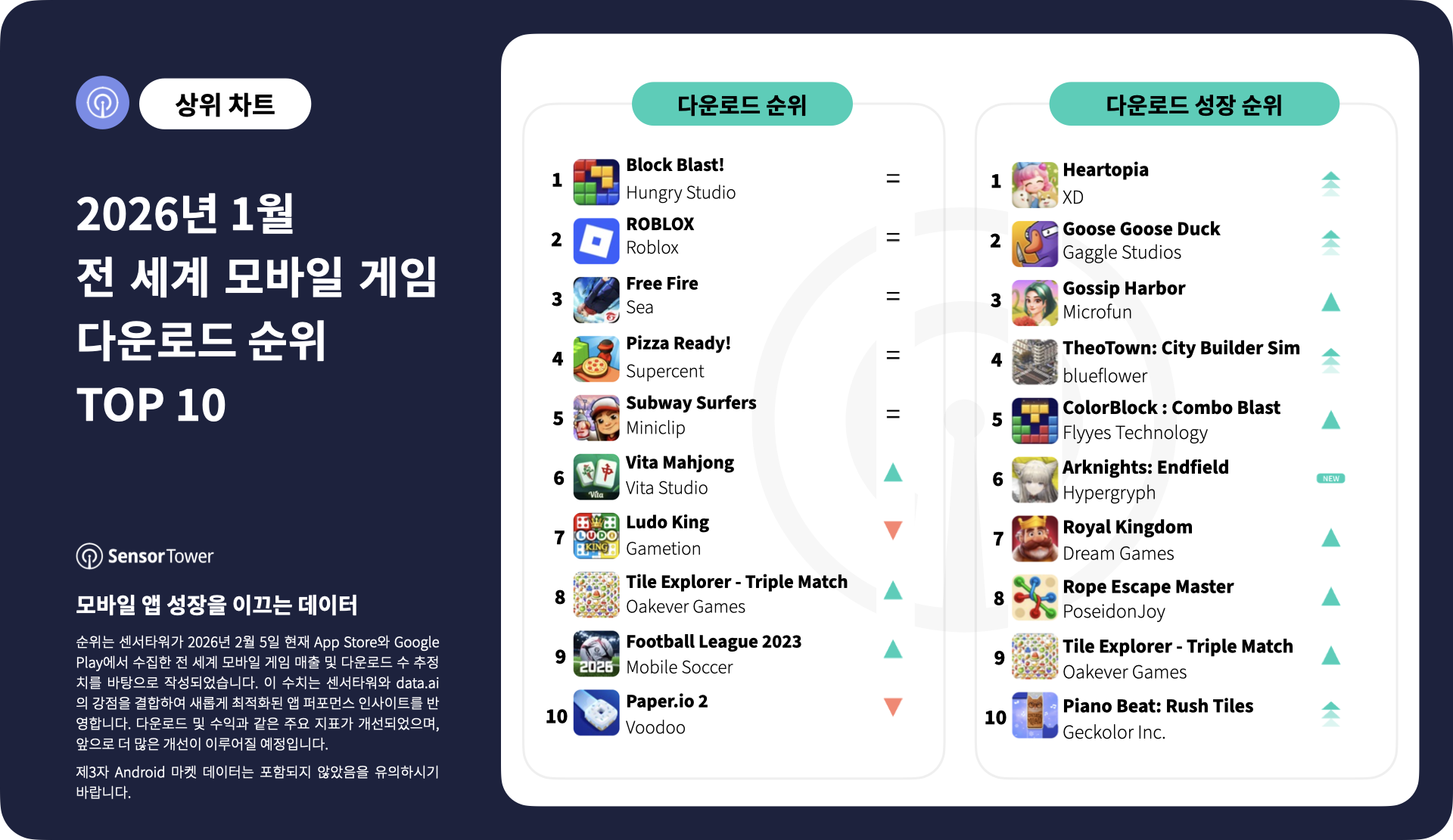 2026년 1월에도 《블록 블라스트》가 전 세계 모바일 게임 다운로드 1위 자리를 지켰습니다. 《로블록스》가 2위를 유지했으며, 《Free Fire》, 《피자 레디》, 《서브웨이 서퍼》가 다운로드 순위 상위 5위를 차지했습니다.