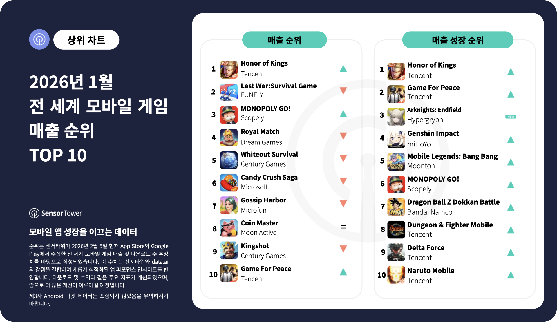 센서타워 앱 퍼포먼스 인사이트에 따르면, 《왕자영요(Honor of Kings)》는 꾸준한 프리미엄 스킨 출시와 신규 영웅 추가, 시즌 진행 시스템에 힘입어 2026년 1월 전 세계 매출 1위를 탈환했습니다. 1월 초 ‘Sun Wukong Fighting Buddha Wushuang’ 무쌍 한정 스킨으로 시작해, 신규 영웅 ‘Da Yu’ 출시와 S42 시즌 업데이트가 이어지며 시의적절한 라이브옵스가 압도적인 매출 성과로 이어진다는 것을 다시 한번 입증했습니다.