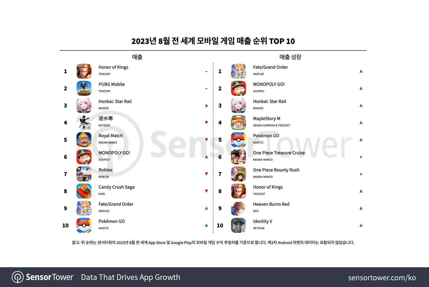 센서타워 스토어 인텔리전스에 따르면, 2023년 8월 Tencent의 《왕자영요(Honour of Kings)》는 전 세계 App Store와 Google Play에서 2억 3,800만 달러의 매출을 기록하며 전 세계 모바일 게임 매출 순위 1위 자리를 지켰습니다. 8월 초, ‘여름 망상’ 시리즈 이벤트와 ‘해월 - 흘림몽로연’ 신규 스킨 출시는 플레이어들의 큰 관심을 효과적으로 이끌었습니다. 8월 10일에는 ‘협곡 보물찾기 - 이벤트 스킨’으로 게임 수익이 더욱 상승했습니다. 또한 8월 18일에는 다양한 ‘칠석’ 한정 스킨과 8월 22일에는 ‘헬로키티’ 테마 스킨이 출시되어 8월 한 달 《왕자영요》 인기를 유지하는 데 도움이 되었습니다. 전 세계 모바일 게임 매출 TOP 10의 전체 목록은 위 차트를 참조해 주세요. 참고: 위 데이터에는 제3자 안드로이드 마켓의 데이터가 포함되어 있지 않습니다.