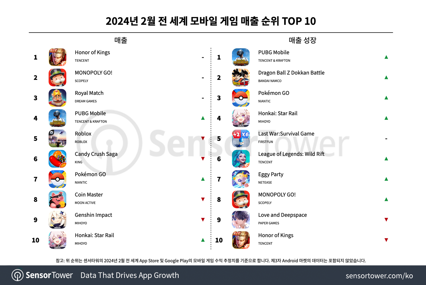 센서타워 스토어 인텔리전스에 따르면, 2024년 2월 Tencent의 《왕자영요(Honour of Kings)》는 전 세계 App Store와 Google Play에서 2억 4,800만 달러의 매출을 기록하며 전 세계 모바일 게임 매출 순위 1위 자리를 유지했습니다. 2월 10일, 이 게임은 설날을 기념하여 한정 스킨 5종과 대규모 콘텐츠 업데이트를 출시하여 2월 중 가장 높은 일매출을 기록했고, 전월 대비 2월 매출은 6% 증가했습니다. 전 세계 모바일 게임 매출 TOP 10의 전체 목록은 위 차트를 참조해 주세요. 참고: 위 데이터에는 제3자 안드로이드 마켓의 데이터가 포함되어 있지 않습니다.