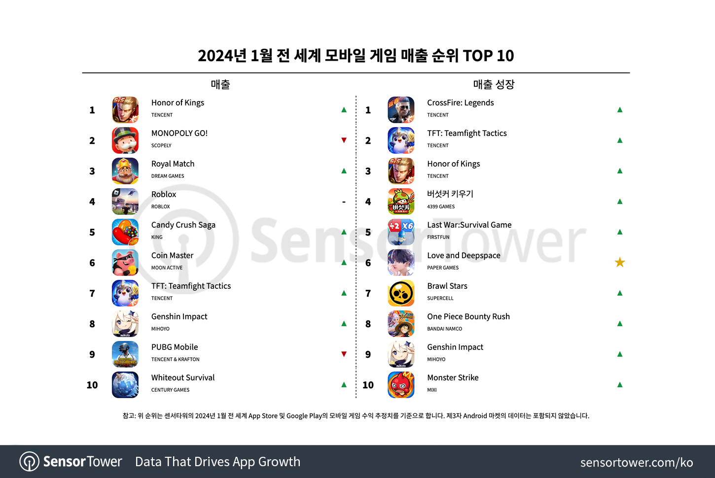 센서타워 스토어 인텔리전스에 따르면, 2024년 1월 Tencent의 《왕자영요(Honour of Kings)》는 전 세계 App Store와 Google Play에서 2억 3,300만 달러의 매출을 기록하며 전 세계 모바일 게임 매출 순위 1위로 돌아왔습니다. 새로운 스킨, 새로운 시즌, 그리고 기간 한정 스킨 출시 등 여러 이벤트의 도움으로 이 게임은 1월 5일, 1월 중 최고 일매출 기록을 세웠습니다. 전 세계 모바일 게임 매출 TOP 10의 전체 목록은 위 차트를 참조해 주세요. 참고: 위 데이터에는 제3자 안드로이드 마켓의 데이터가 포함되어 있지 않습니다.