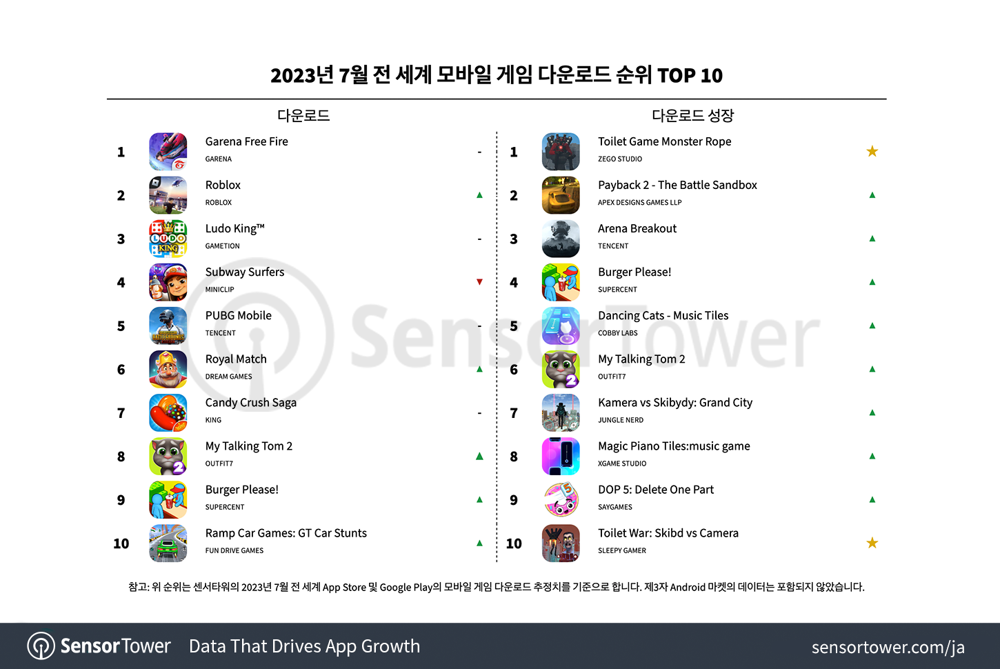 Gametion의 《루도 킹(Ludo King)》, Miniclip의 《서브웨이 서퍼(Subway Surfers)》, 그리고 《배틀그라운드 모바일 (PUBG Mobile)》이 각각 다운로드 3위, 4위, 5위에 올랐습니다.