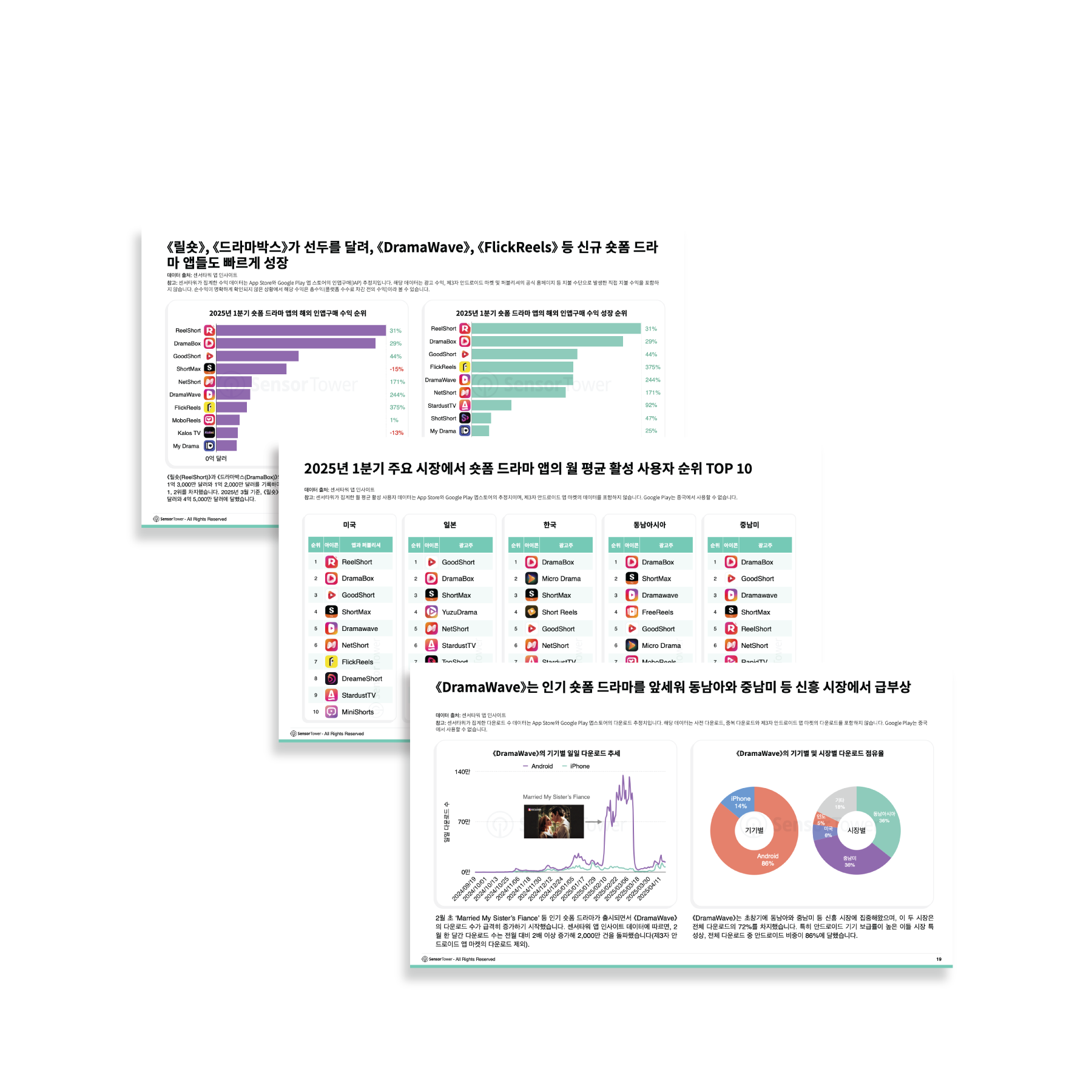 2025년 한국, 미국, 일본, 동남아, 중남미 등 주요 시장에서 숏폼 드라마 앱 순위를 살펴볼 수 있습니다.