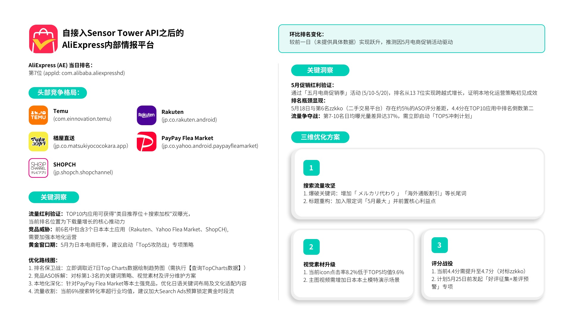 Sensor Tower API 的接入,使第三方市场数据能够为 AliExpress 更稳定、高效地使用,并更直接地服务于产品与增长决策。