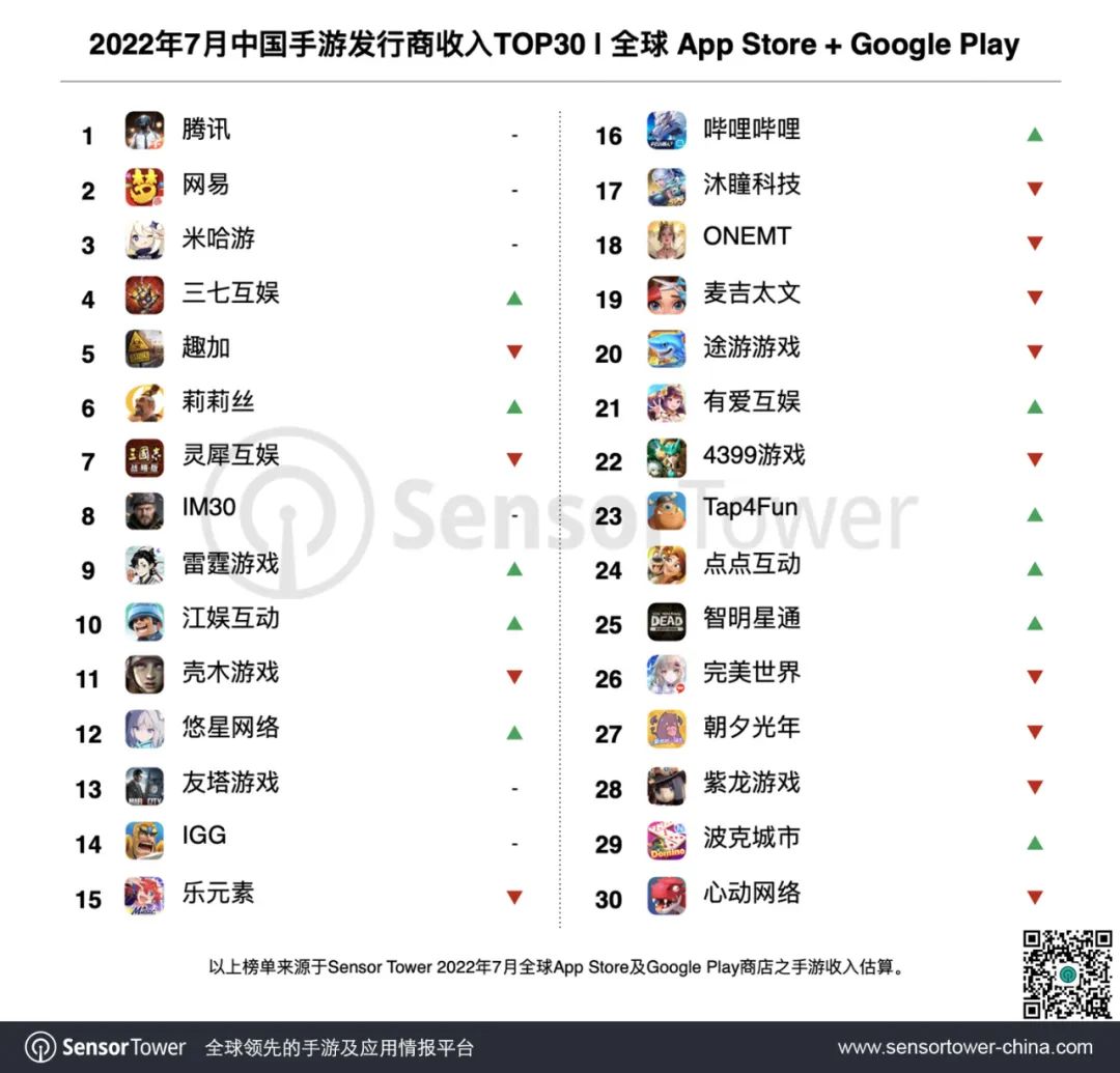 Sensor Tower商店情报平台显示,2022年7月中国手游发行商在全球 App Store 和 Google Play 的收入排名。本期共39个中国厂商入围全球手游发行商收入榜TOP100,合计吸金超过20.3亿美元,占全球TOP100手游发行商收入38.1%,详细报道如下。