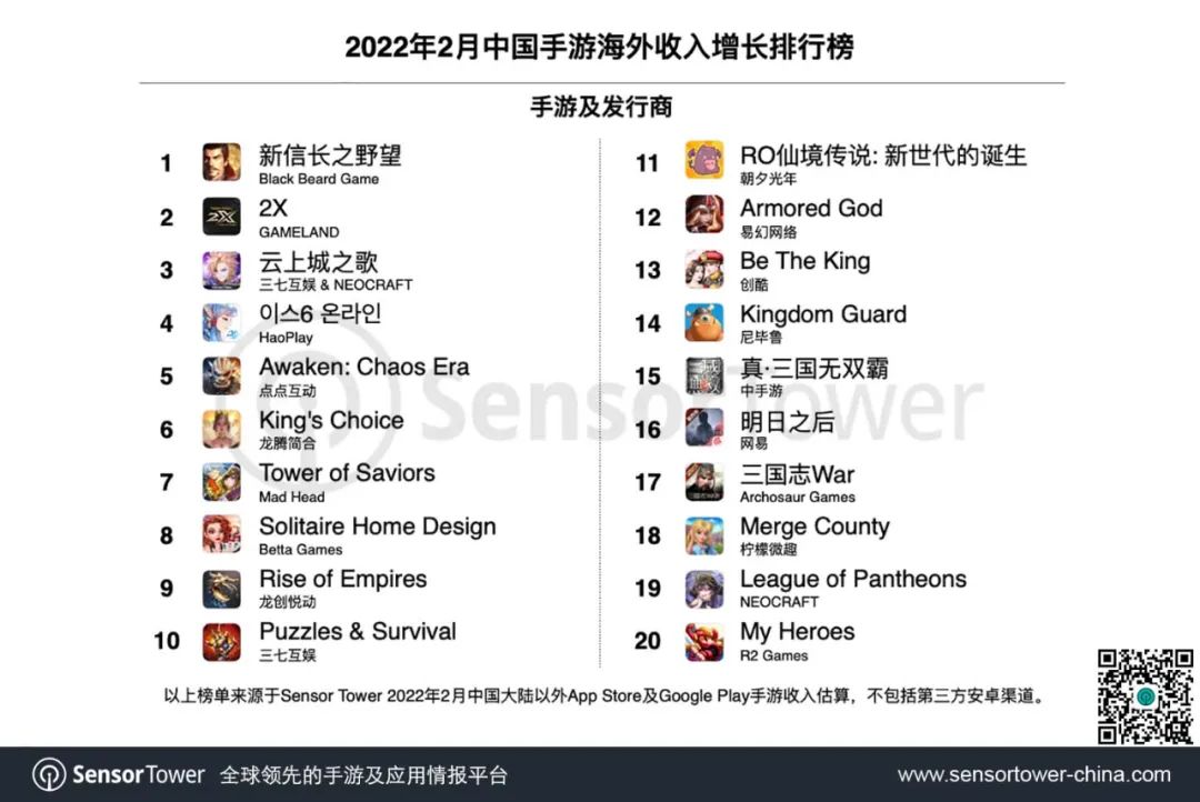 BBGame旗下SLG手游《新信长之野望》2月在中国港澳台地区上线。由于光荣特库摩IP在亚洲市场的强大号召力,该游戏成为本期中国香港热度最高的新游,并登顶手游收入增长榜。