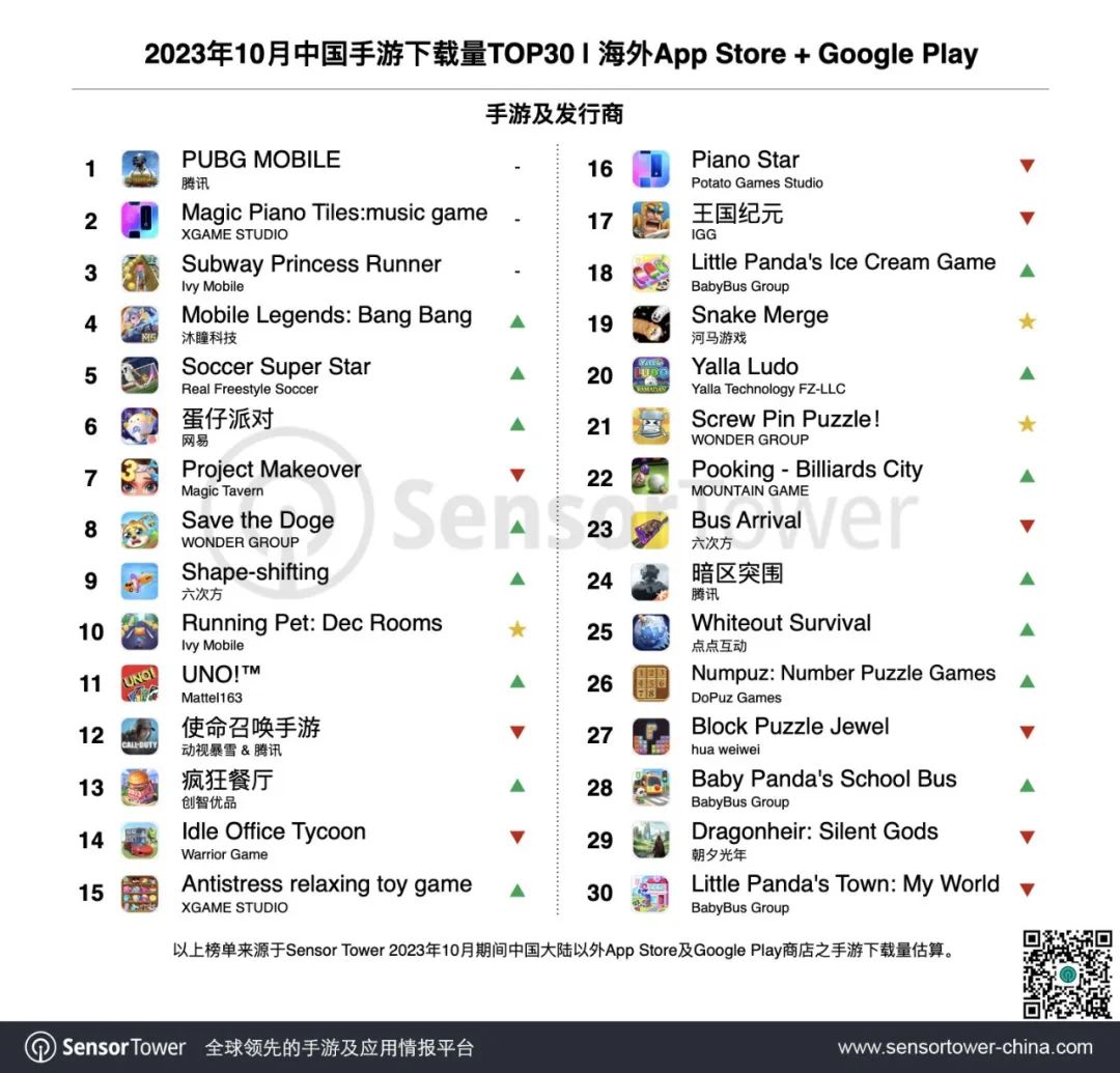 Sensor Tower商店情报平台最新数据显示,2023年10月中国手游产品在海外市场收入及下载量排行榜,详细榜单变化如下。