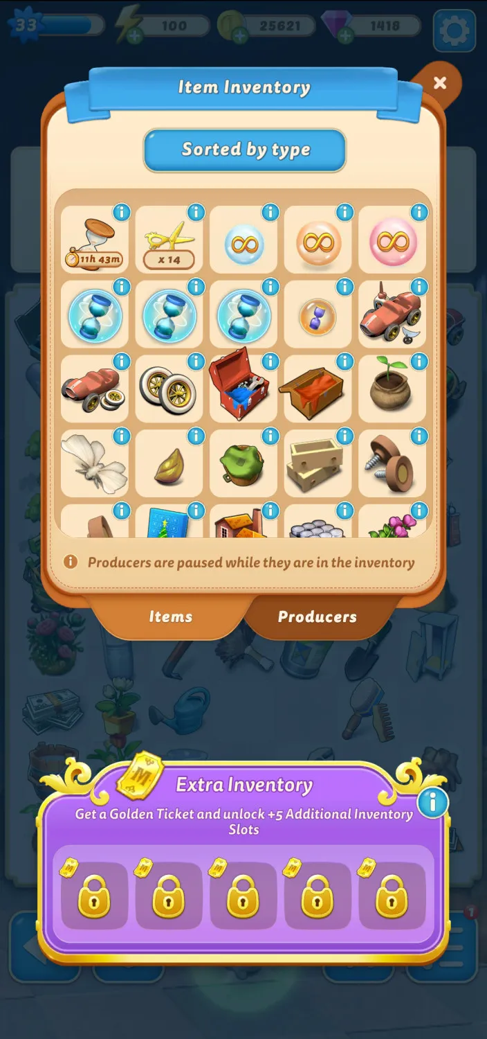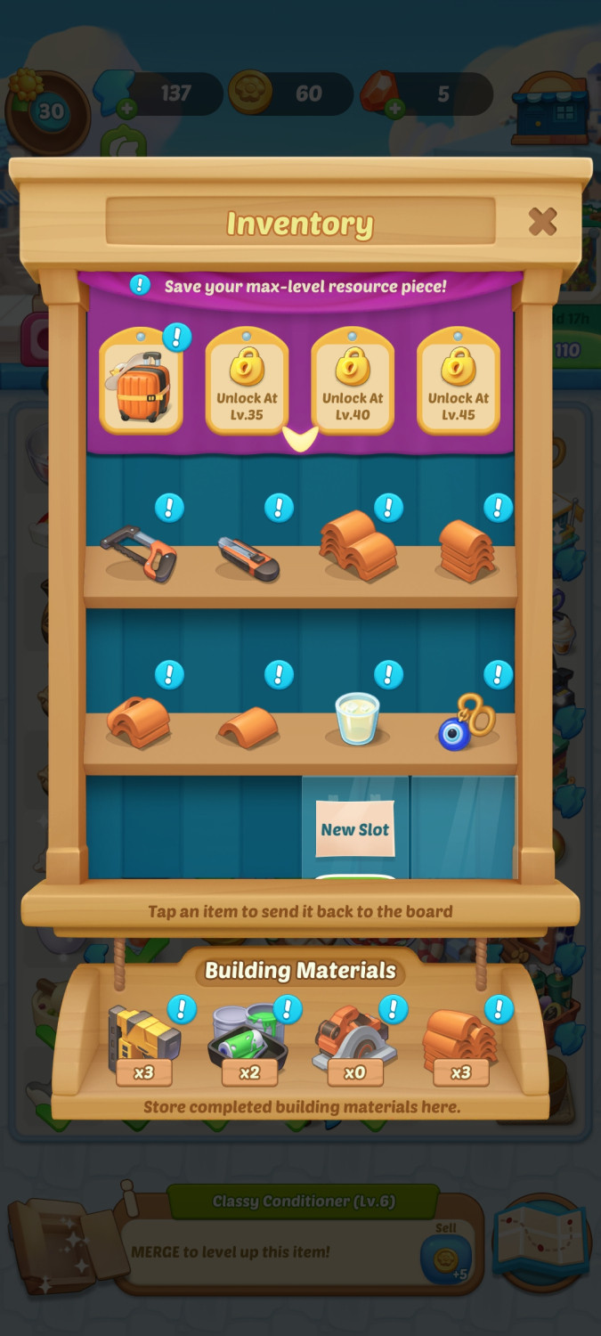 为了让背包更有条理,一些游戏引入了分类功能。例如,《Merge Mansion》为生产器(Producers)设立了专属的标签页。而《Seaside Escape: Merge & Story》和《Travel Town》则更进一步,为满级生产器和满级建筑材料设置了独立的专属槽位。这种设计让玩家能够高效管理不同类型的物品,解决了后期物品繁多造成的混乱。
