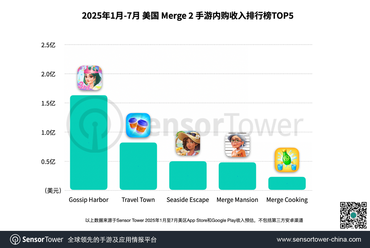 来自柠檬微趣的两款手游无疑是驱动品类增长的核心力量。在2025年1月至7月美国市场 Merge 2手游收入排行榜前五中,柠檬微趣旗下《Gossip Harbor》和《Seaside Escape》分列第1和第3名,排名前五的另外三款游戏依次为:《Travel Town》、《Merge Mansion》、《Merge Cooking》。