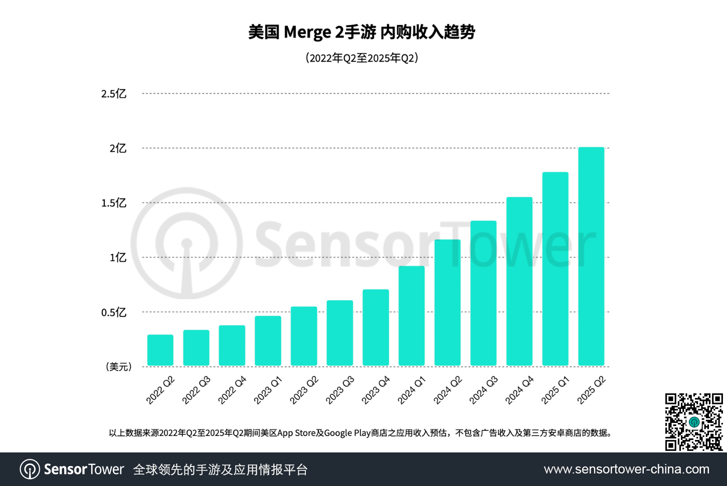 在竞争激烈的移动游戏市场,合并玩法凭借其轻松有趣的核心机制持续吸引着大量玩家。根据 Sensor Tower 的最新数据,二合类游戏(Merge-2)是近期表现最火爆的品类之一,其全球收入规模在过去近三年中呈现出显著的增长趋势。数据显示,该品类的季度收入从2022年Q2 3100万美元左右,激增至2025年Q2超过2亿美元,同比增长72%。