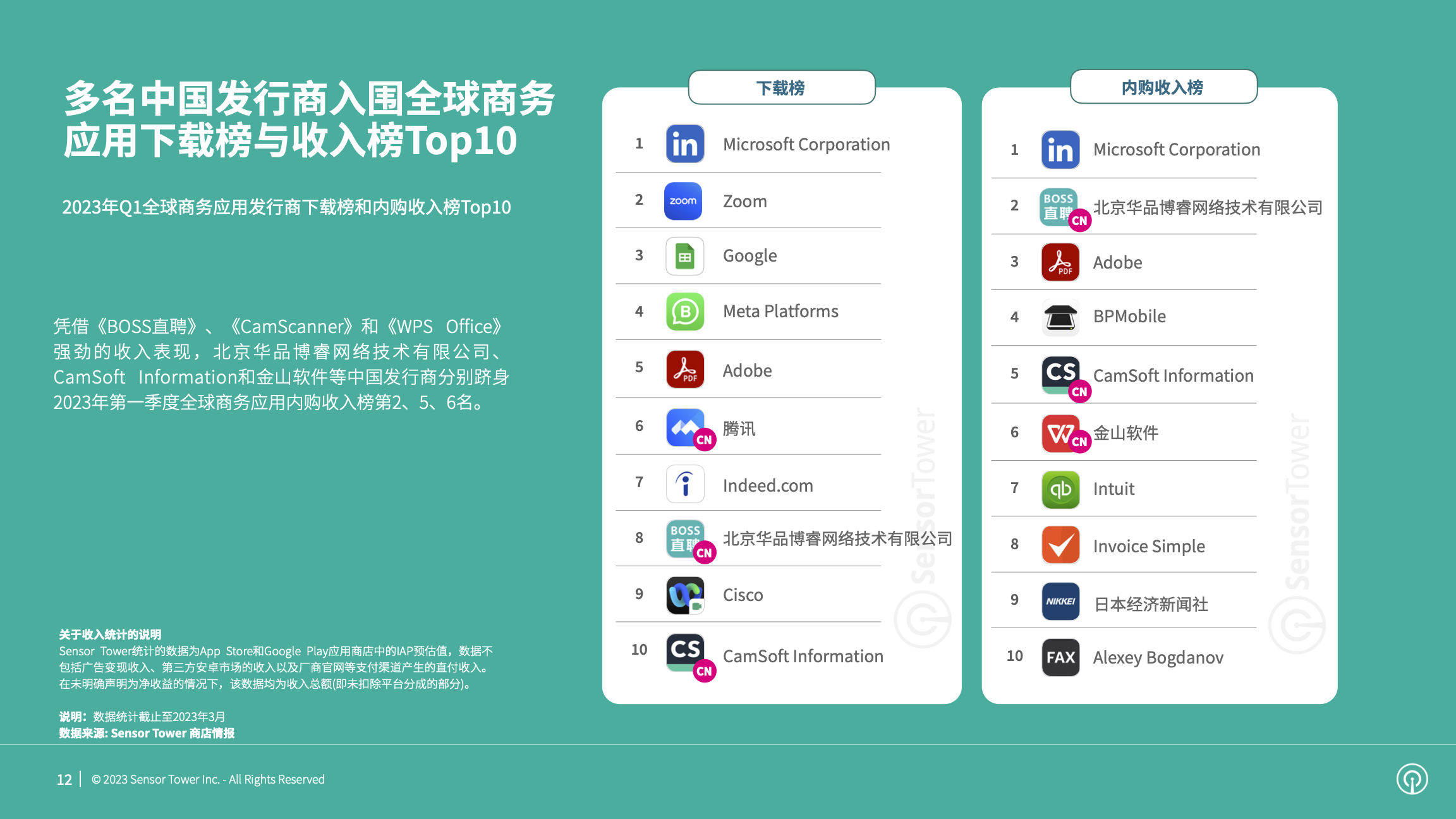发行商榜单方面,《BOSS直聘》、《CamScanner》和《WPS Office》收入表现强劲,助力北京华品博睿、CamSoft和金山软件入围2023年第一季度全球商务应用发行商内购收入榜第2、5、6名。