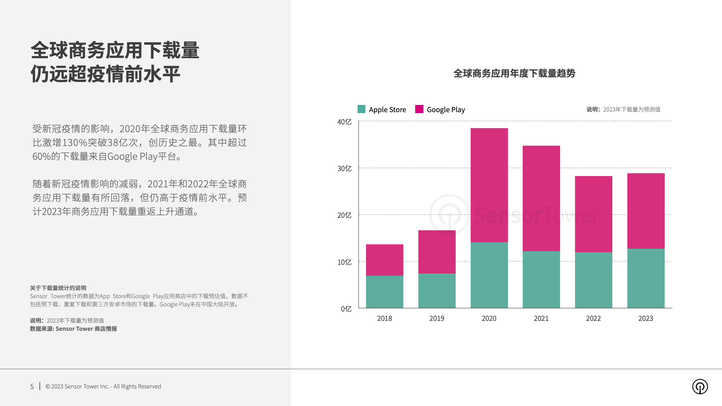 受新冠疫情的影响,2020年全球商务应用下载量环比激增130%突破38亿次,创历史之最。2021年和2022年商务应用下载量有所回落,但仍高于疫情前水平。