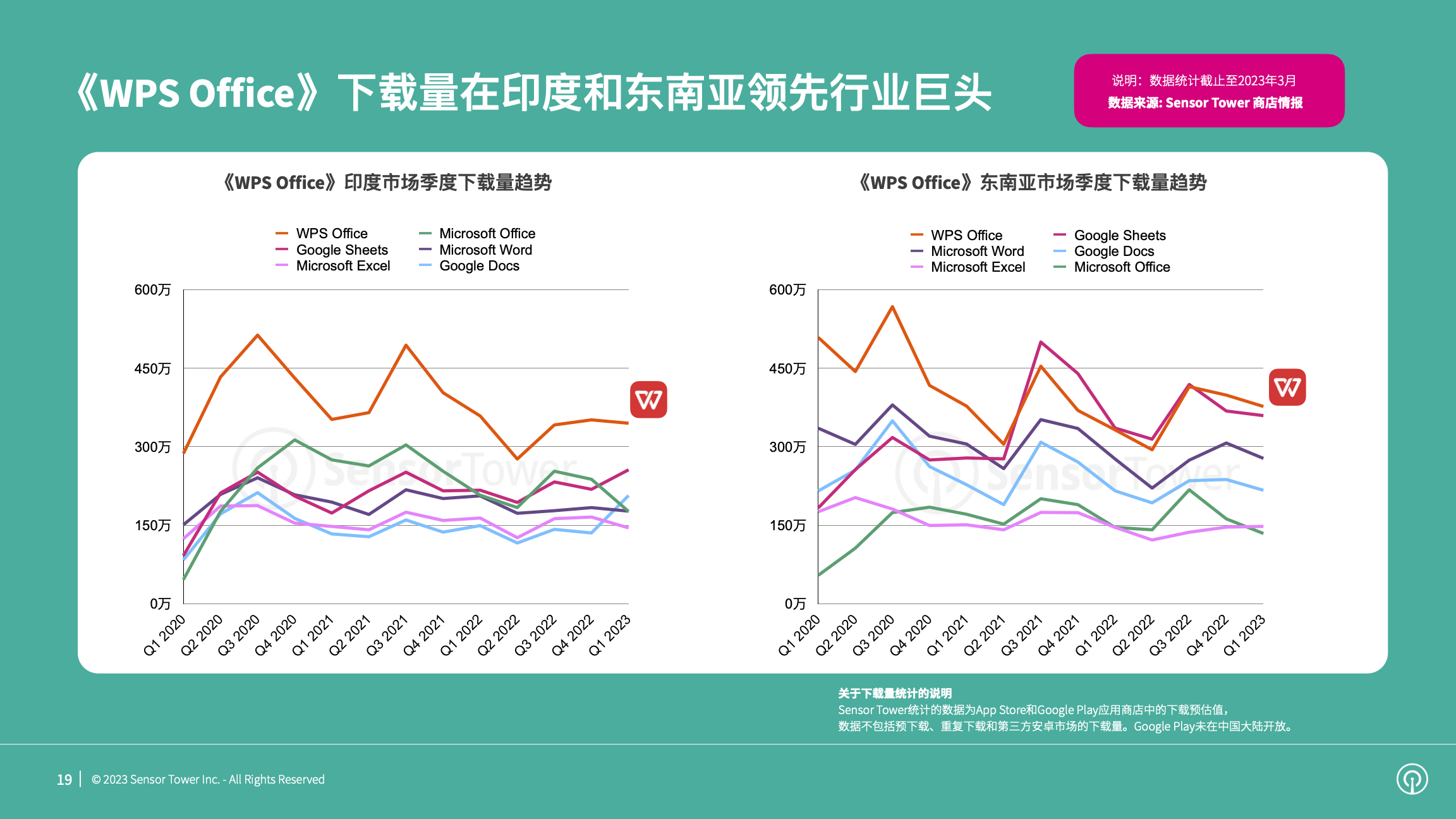 《WPS Office》不仅在本土市场表现优异,差异化的市场策略使得该应用从海外竞争激烈的在线文档市场脱颖而出。在印度和东南亚,《WPS Office》下载量超越《Microsoft Office》和《Google Docs》,领先微软和谷歌等行业巨头。