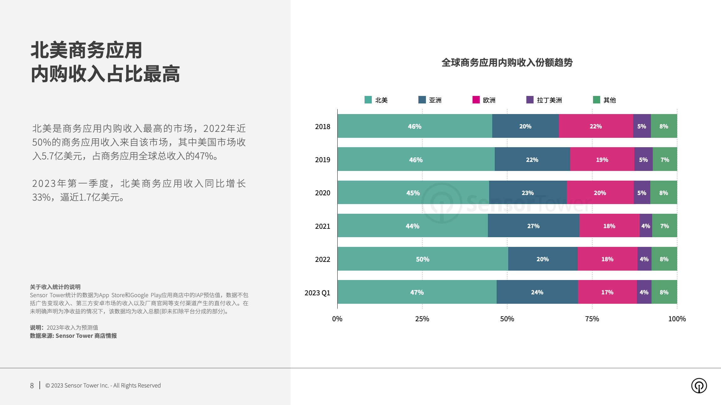 北美是商务应用内购收入最高的市场,2022年近50%的商务应用收入来自该市场。2023年第一季度,北美商务应用收入同比增长33%,逼近1.7亿美元。