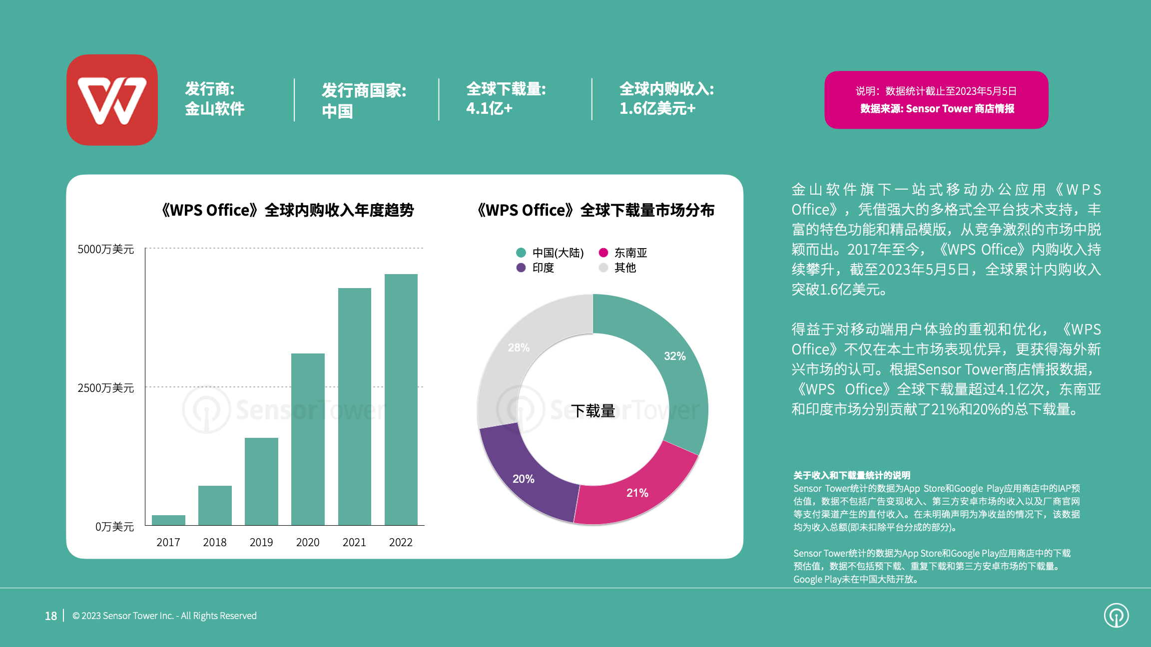 得益于轻量、全兼容的移动端优势,以及特色功能和精品模版等特点,金山软件旗下移动办公应用《WPS Office》内购收入持续攀升,截至2023年5月5日全球累计内购收入突破1.6亿美元。