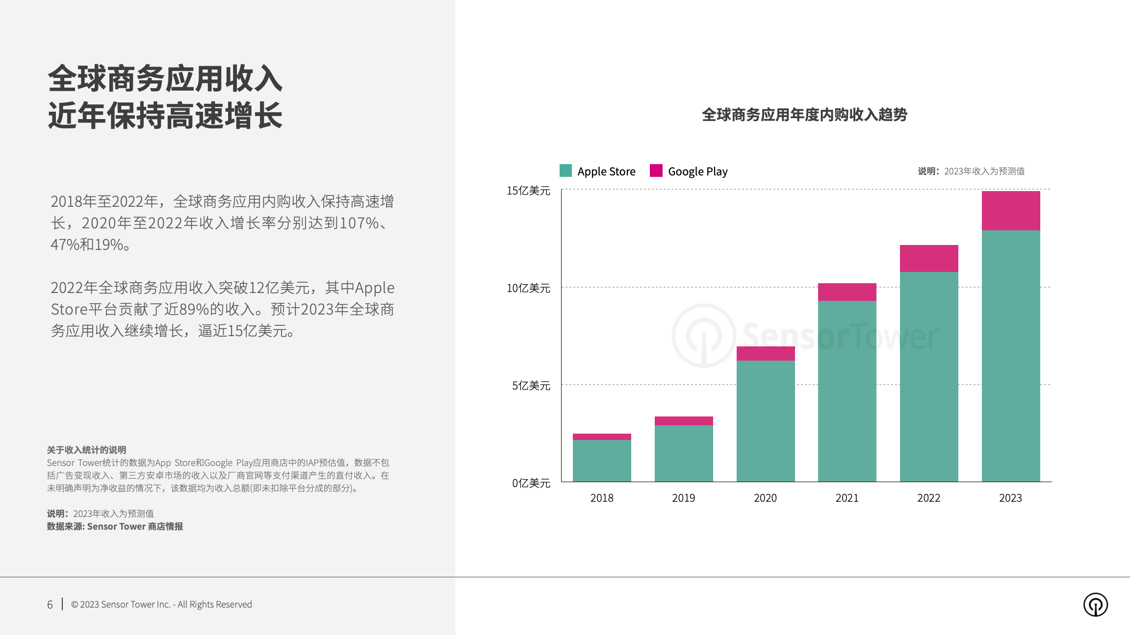 近年来,全球商务应用内购收入持续攀升,2020年至2021年收入增长率分别达到107%和47%。2022年全球商务应用收入继续增长,突破12亿美元。