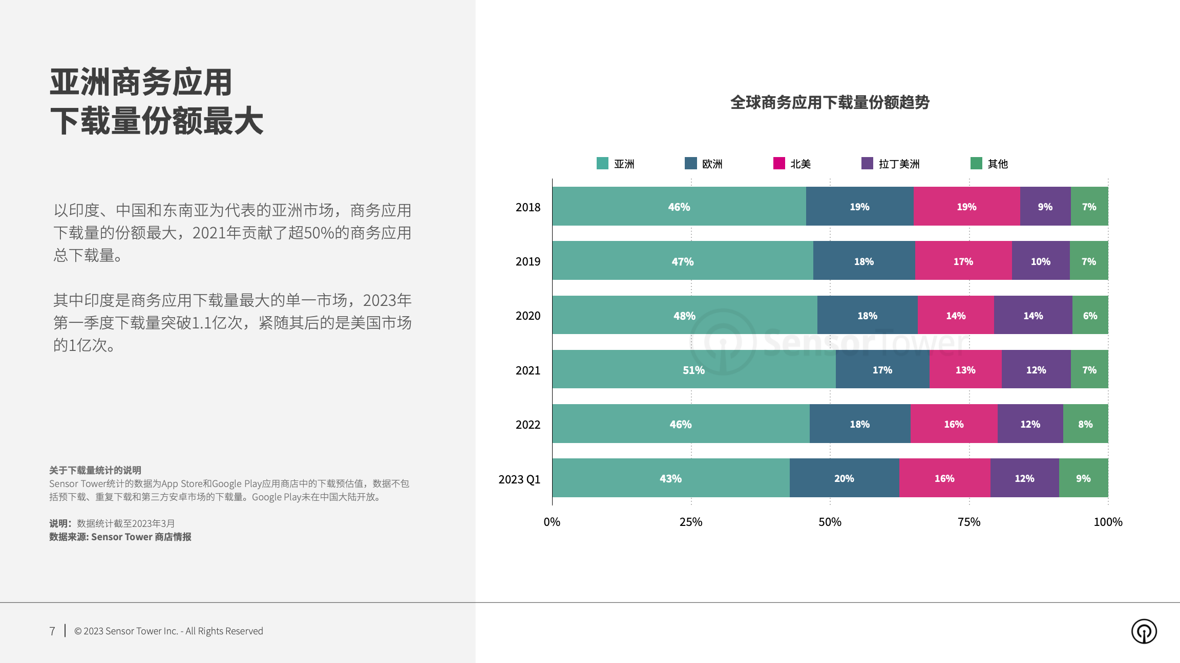 亚洲市场商务应用下载量的份额最大,2021年贡献了超50%的商务应用总下载量。其中印度是商务应用下载量最大的单一市场,2023年第一季度下载量突破1.1亿次。