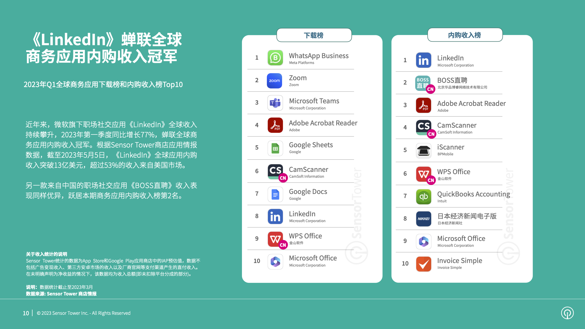 2023年第一季度,微软旗下职场社交应用《LinkedIn》收入同比增长77%,蝉联全球商务应用内购收入冠军。来自中国的职场社交应用《BOSS直聘》收入表现同样优异,跃居本期内购收入榜第2名。