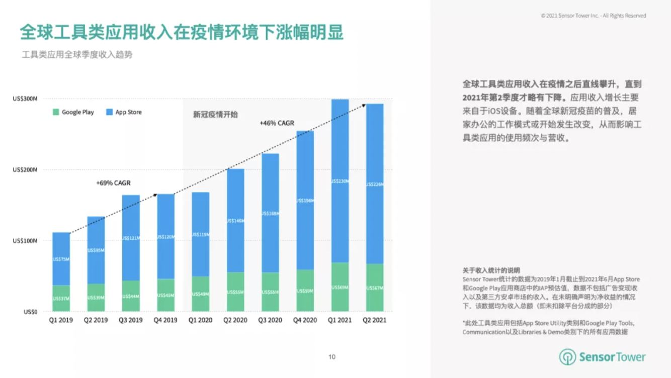 疫情环境下,居家办公的工作模式成为常态,全球工具类应用收入因此急速攀升,并在2021年第1季度达到峰值2.9亿美元。这一趋势直到2021年第2季度才略有下降,但仍较疫情爆发前高出46%。