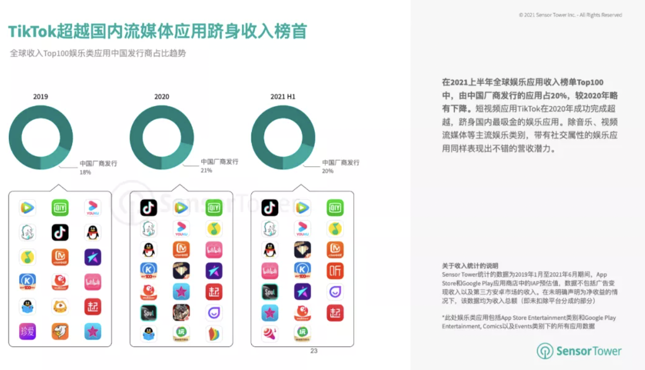 在2021上半年全球收入最高的100款娱乐应用中,共有20款来自中国厂商。在音乐、视频流媒体等主流娱乐类别之外,Soul、会玩等带有社交属性的娱乐应用同样表现出不俗的营收潜力。