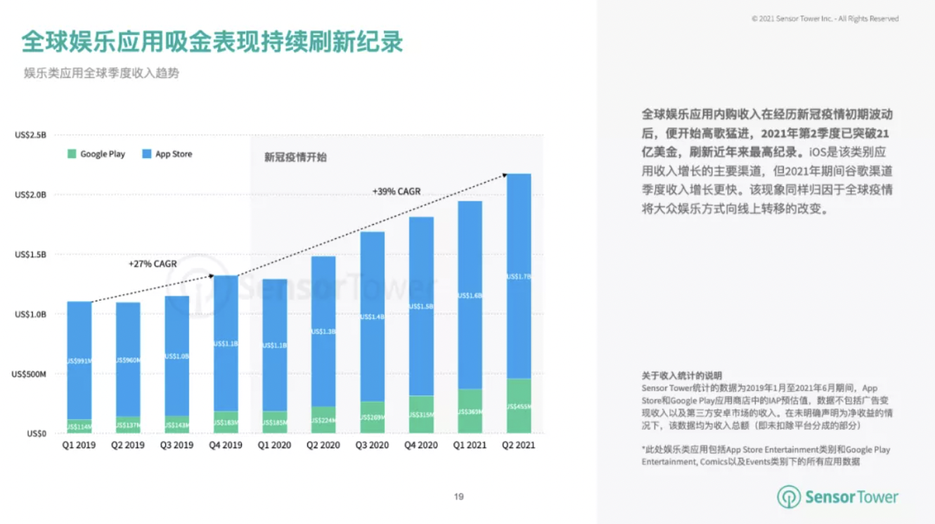疫情爆发之后,由于人们从线下娱乐转移至线上,娱乐应用收入开始激增。2021年第2季度,全球娱乐应用内购收入突破21亿美元,刷新近年来最高纪录。