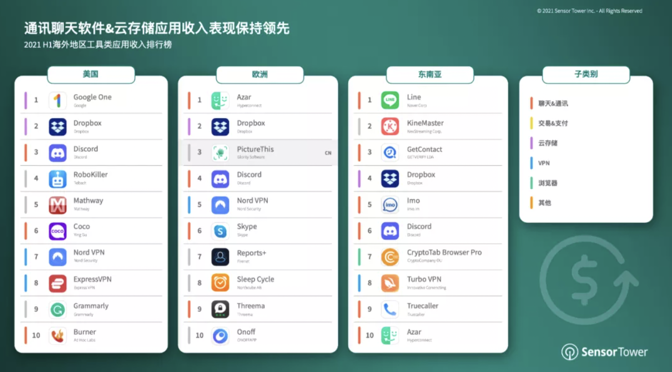 从2021上半年工具类应用收入榜来看,美国⽤户倾向为云存储服务付费,东南亚用户偏好在聊天应⽤上进⾏消费。此外,办公、安全与VPN应⽤均榜上有名。