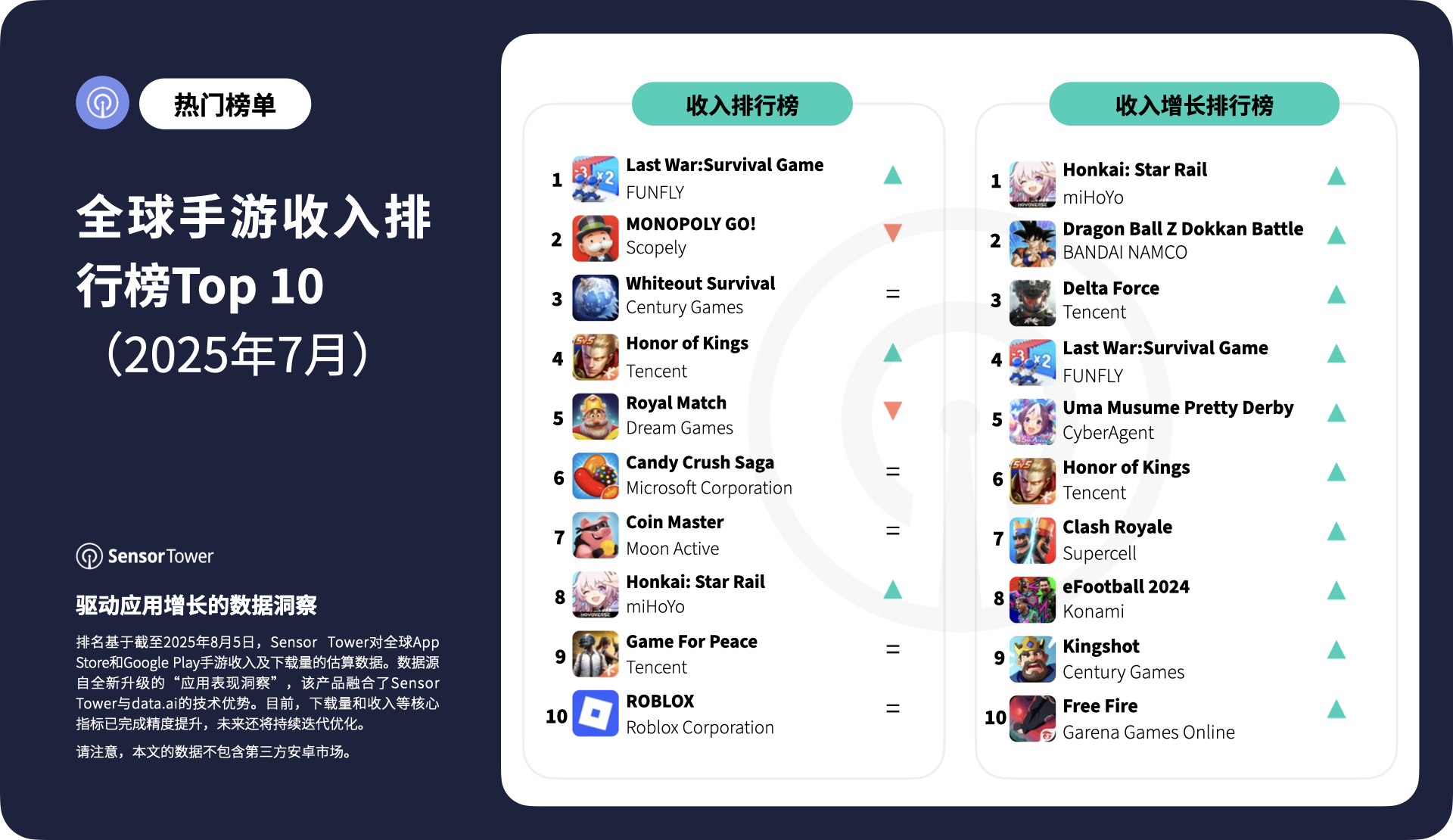 根据Sensor Tower的“应用表现洞察”数据,FUNFLY旗下的《Last War: Survival》荣登全球手游收入榜首。紧随其后的是Scopely的《MONOPOLY GO!》和点点互动的《Whiteout Survival》,分列第2、3位,《王者荣耀》和《Royal Match》也成功跻身前五。